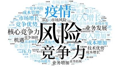 以景气预期特征词及其词频总计数生成词云,可以发现“风险”“竞争力”“疫情”“收入增长”“核心竞争力”是频数最高的5个特征词,出现次数分别为10103次、4616次、3498次、2101次以及1865次,占总词频分别为17%、8%、6%、4%以及3%。整体来看,当前由于宏观经济形势背景与疫情所带来的影响,企业对于由此所伴随的风险和不确定性是持非常谨慎的态度。