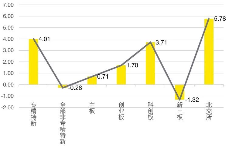 报告将719家专精特新上市公司样本作为整体分别与主板/创业板/科创板/新三板/北交所的非专精特新企业进行比较,结果表明专精特新上市公司在盈利能力上具有较为良好的表现。