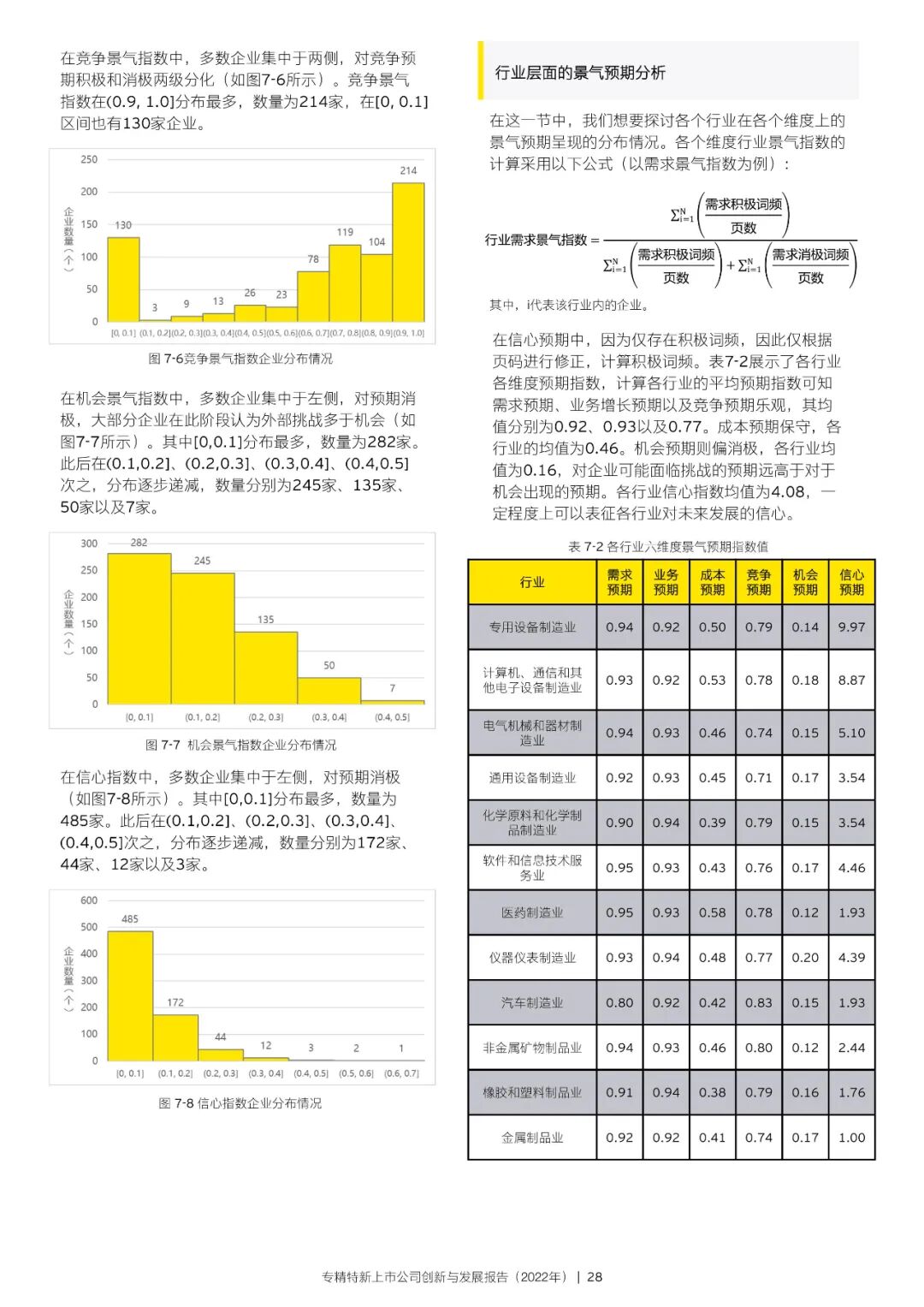 在上市公司年报中的“管理层讨论与分析章节”中未来展望部分,企业管理层会介绍企业的未来发展战略、经营计划以及挑战和应对举措等。在表述这些内容的文本当中,所使用的与景气相关的词汇,可以很好地揭示管理层对于企业发展的景气预期。报告运用文本分析的方法,识别专精特新上市公司在“需求、业务、成本、竞争、信心和机会”这些不同景气预期维度上的特征词谱,并在此基础上形成对专精特新上市公司的景气预期的量化结果。