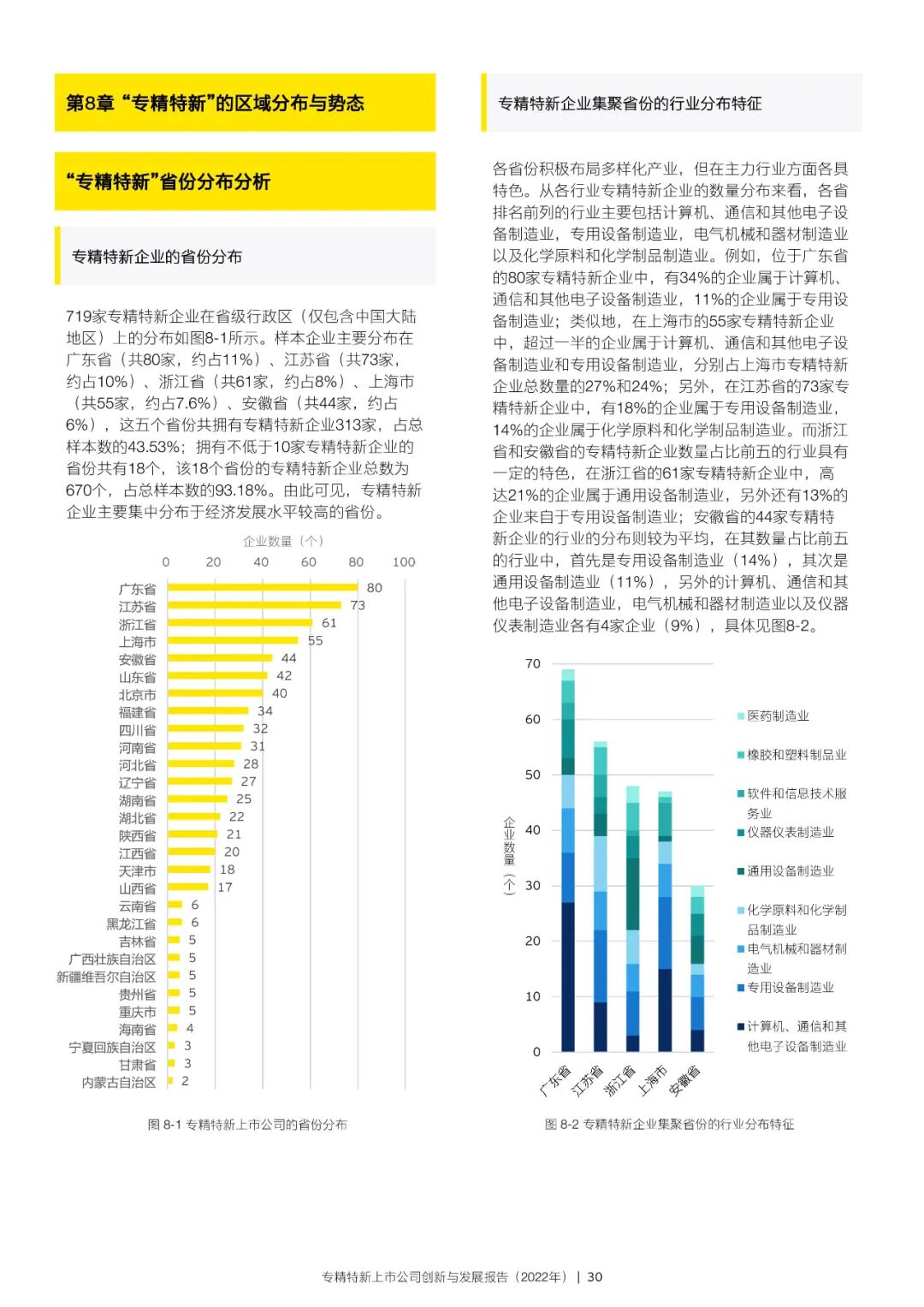 该报告以深度挖掘上市公司专利数据、年报中财务数据及文本数据的多元数据融合方法,以719家专精特新“小巨人”上市(挂牌)公司(2021年及之前在A股主板、创业板、科创板、北京证券交易所、新三板上市或挂牌)为样本,分析了专精特新“小巨人”企业创新与发展态势、景气预期、国产替代趋势、数字化关注等情况,并归纳了当前专精特新“小巨人”企业在发展当中存在的四个典型问题。