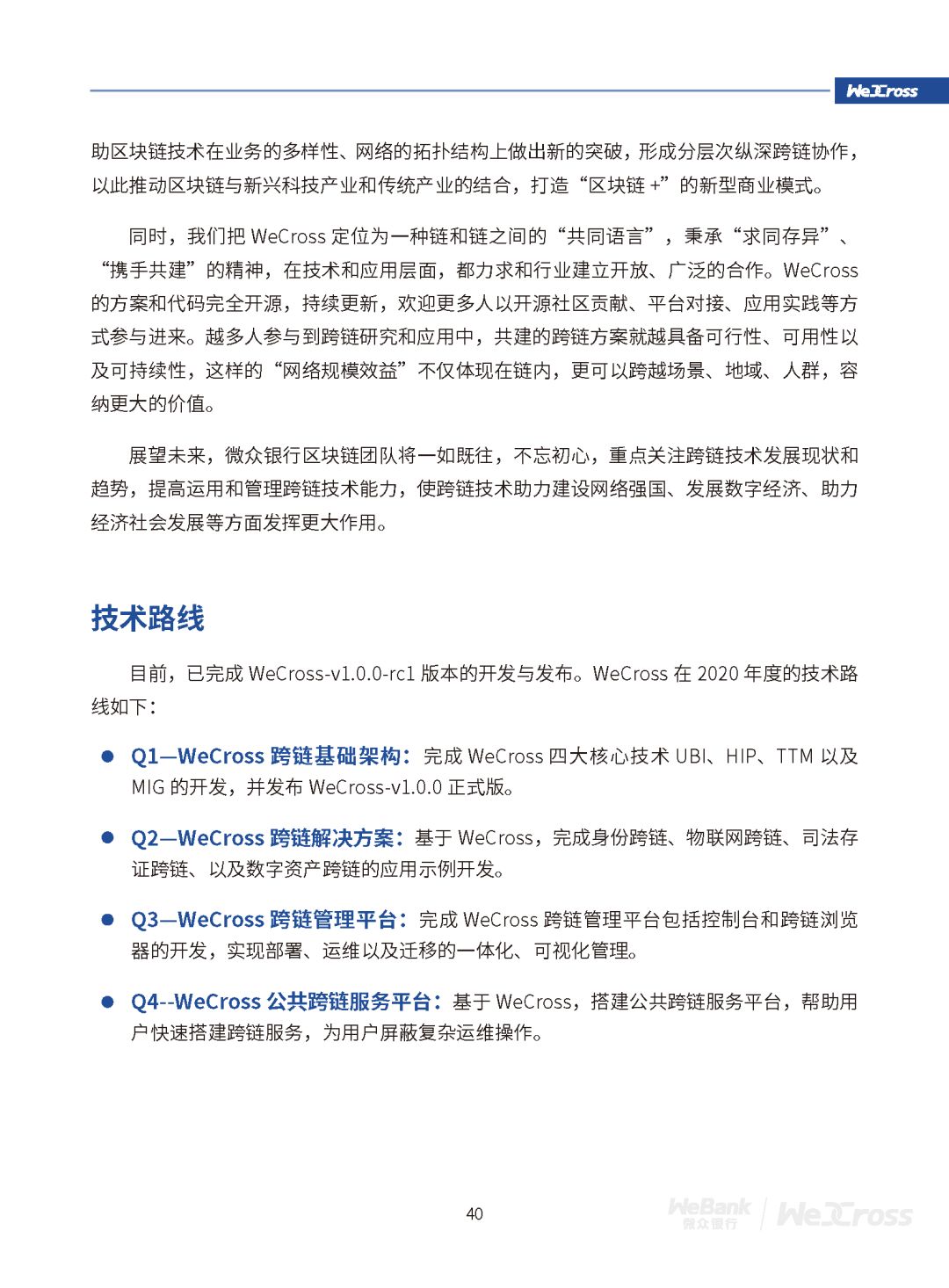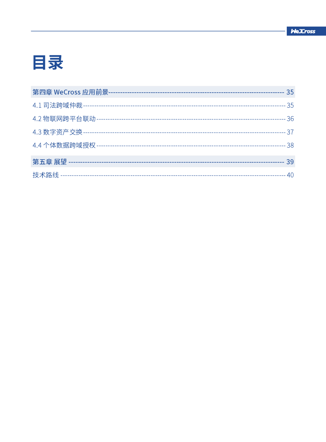 目前,WeCross已经围绕司法跨域仲裁、物联网跨平台联动、数字资产交换、个体数据跨域授权等具体应用场景提出了针对性解决方案。未来,WeCross将会作为分布式商业区块链互联的基础架构,持续促进跨行业、机构、地域的跨区块链价值交换和商业合作,推动区块链应用生态的深度融合发展。