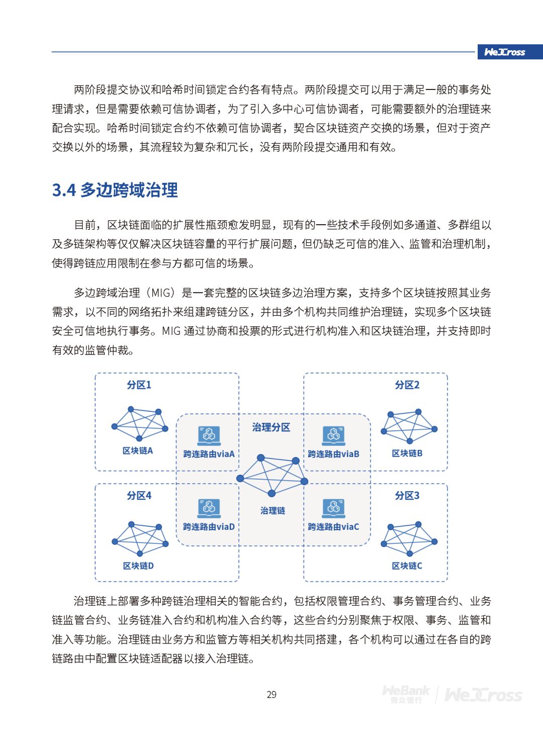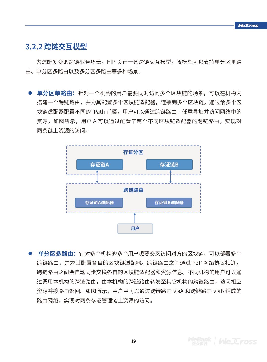 基于此设计理念,WeCross创新性提出UBI通用区块链接口、HIP异构链互联协议、TTM可信事务机制、MIG多 边 跨 域 治 理四个核心技术,实现了跨链交互的高效可用、安全可信和便捷治理。