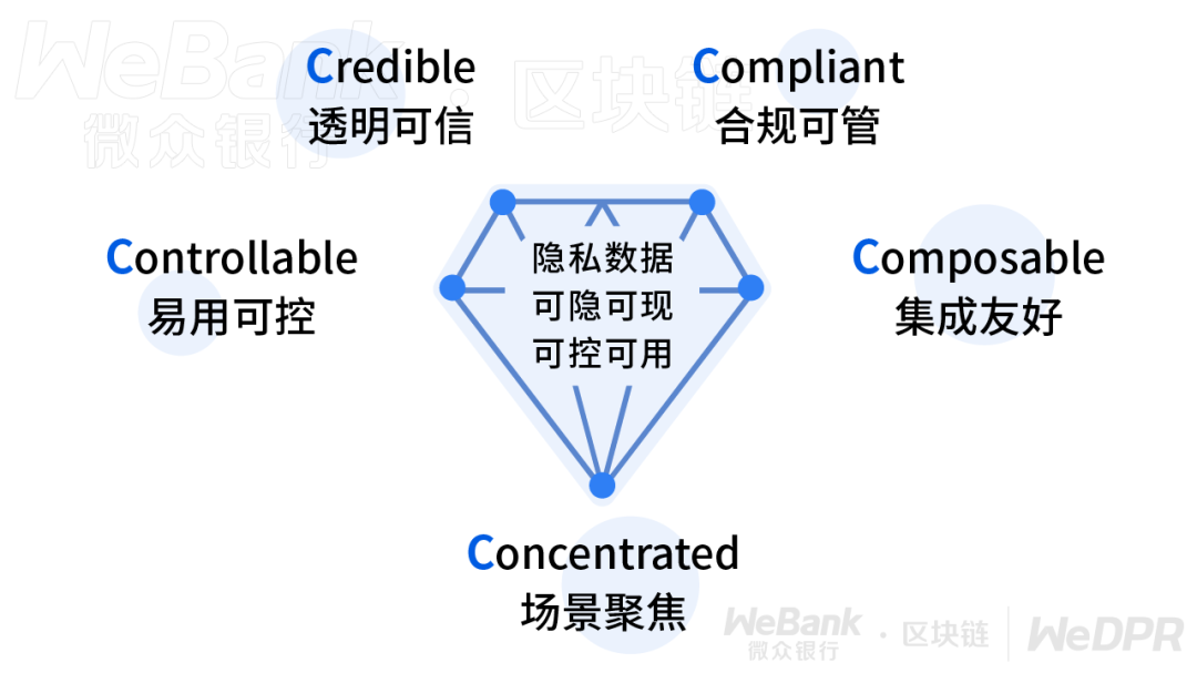 WeDPR致力于解决业务数字化中隐私不“隐”、共享协作不可控等隐私保护风险痛点,在“数据可用不可见”的基础上更进一步,实现隐私数据的“可隐可现、可控可用”的5C隐私保护效果,消除隐私主体的隐私顾虑和业务创新的合规壁垒,助力基于隐私数据的核心价值互联和新兴商业探索,营造公平、对等、共赢的多方数据协作环境,达成数据价值跨主体融合和数据治理的可控平衡。