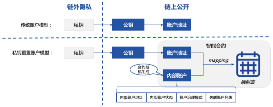 在账户治理组件中,账户不再采用公钥地址,而是采用公钥账户加内部随机账户的双层账户体系。