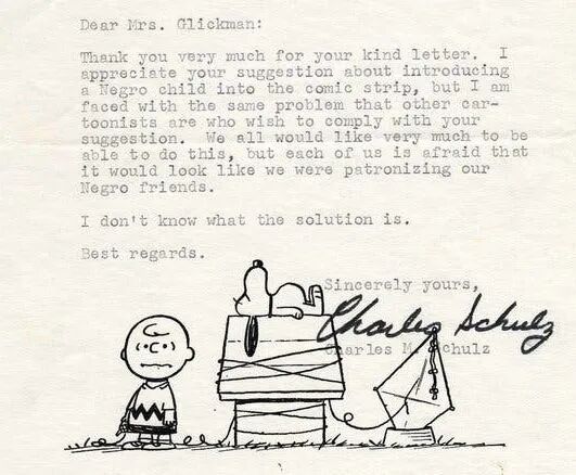 马丁·路德·金于 1968 年被枪击后,舒尔茨收到了来自加利福尼亚一名退休教师 Harriet Glickman的一封信,要求他将“黑人”儿童纳入到《花生漫画》的大家族中,用来帮助促进种族之间的理解。