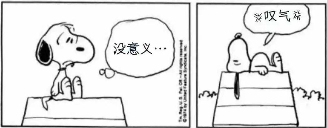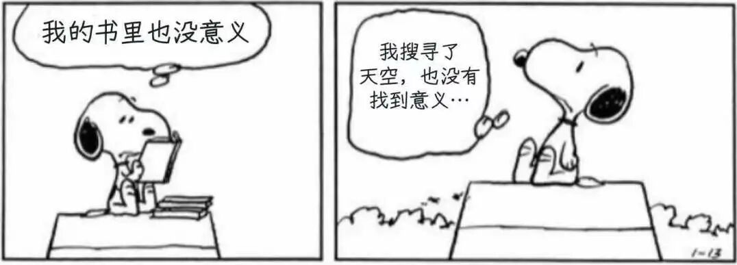 在这篇经典的连环画中,Snoopy 正躺在他的狗窝上,试图理解生命的意义。直到 Charlie Brown 带着装满食物的狗盘出现在他的面前才让 Snoopy 顿悟。