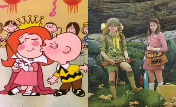 在《月升王国》这个以小孩子的视角讲述故事的电影中,Wes Anderson 不仅把场景和分镜设计得很像《花生漫画》,故事中的男女主角也让人很容易联想到 Charlie Brown 和 红发女孩。