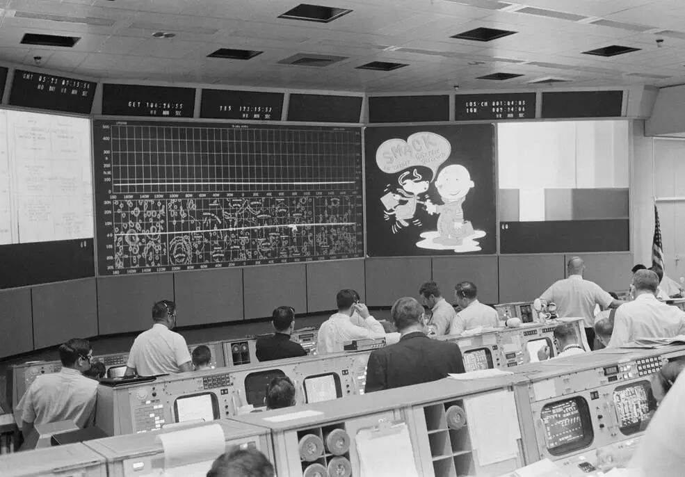 Snoopy 和 Charlie Brown 坐在任务控制中心的控制台上