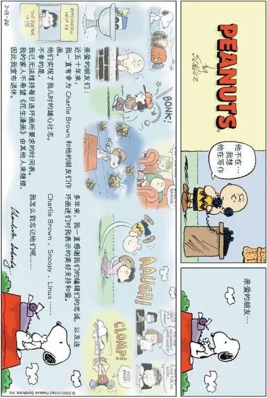 而就在他去世的同一天,《花生漫画》中最后一幅连环画被印刷出版。将 70 年来舒尔茨的热爱和感谢传递到全世界热爱《花生漫画》的人们手中。