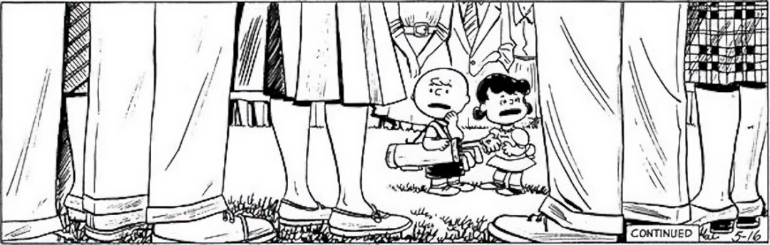 在舒尔茨创造的“花生世界”中,只有 Charlie Brown 和他的朋友们,却没有一个大人。虽然在他们的口中,我们可以得知 Charlie 的父亲是一名理发师(和舒尔茨的父亲职业相同);蛮横的邻家女孩 Violet 的父亲是一名大学教授,但是漫画里的大人们只有两条腿。