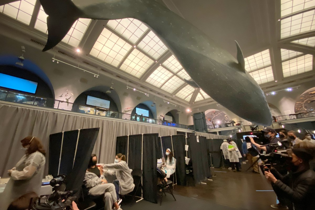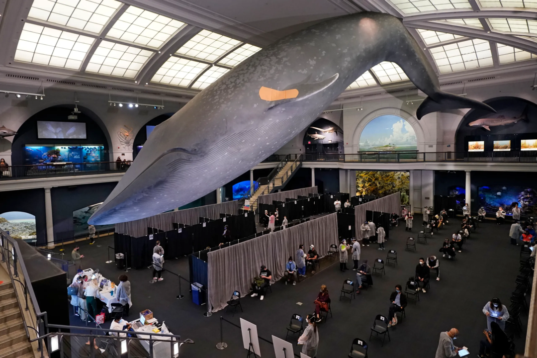 美国自然历史博物馆(American Museum of Natural History)也在 2021 年 4 月成了疫苗接种中心。这意味着,纽约市民可以在那只将近三十米长的巨鲸下面打疫苗了,而纽约市长 Bill de Blasio 则说,自然历史博物馆的疫苗合作也成了“我们时代的一只温暖鲸鱼”。