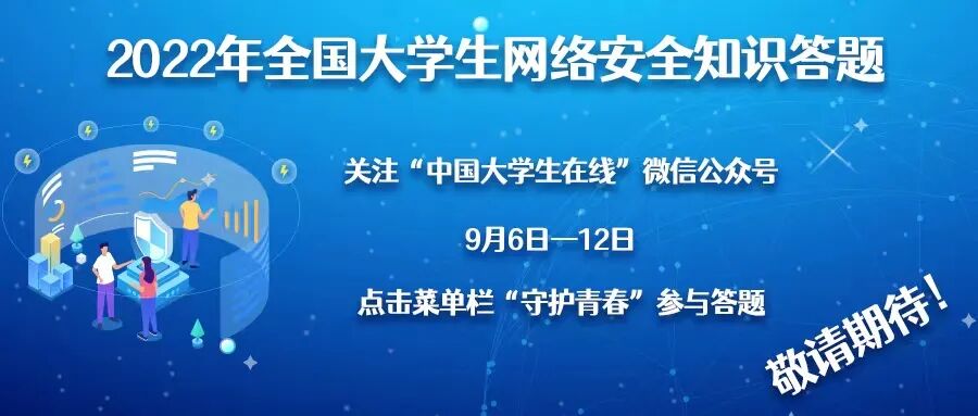 9月6日至12日,教育部思想政治工作司、公安部刑事侦查局指导中国大学生在线举办“守护青春 网络有你”全国大学生网络安全知识答题活动,通过线上答题方式普及网络安全知识,提高大学生防范网络诈骗、安全使用网络的能力。师生可通过“中国大学生在线”微信公众号,点击菜单栏“守护青春”参与答题。