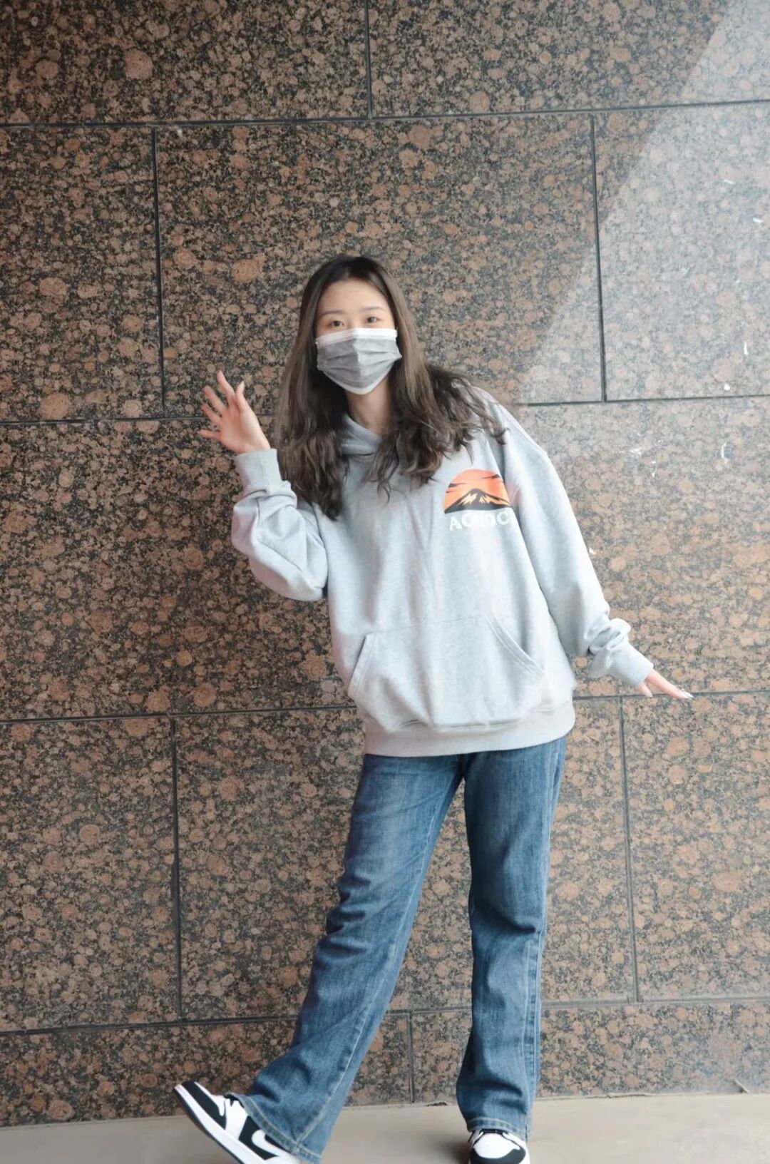 简约风的灰色连帽卫衣与直筒牛仔裤,搭配黑白配色的板鞋,运动与休闲兼具。