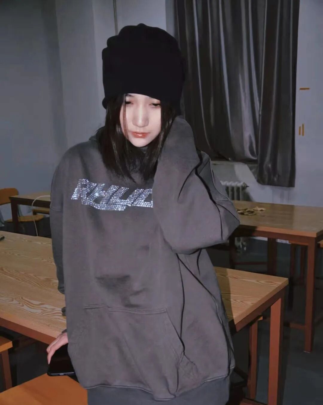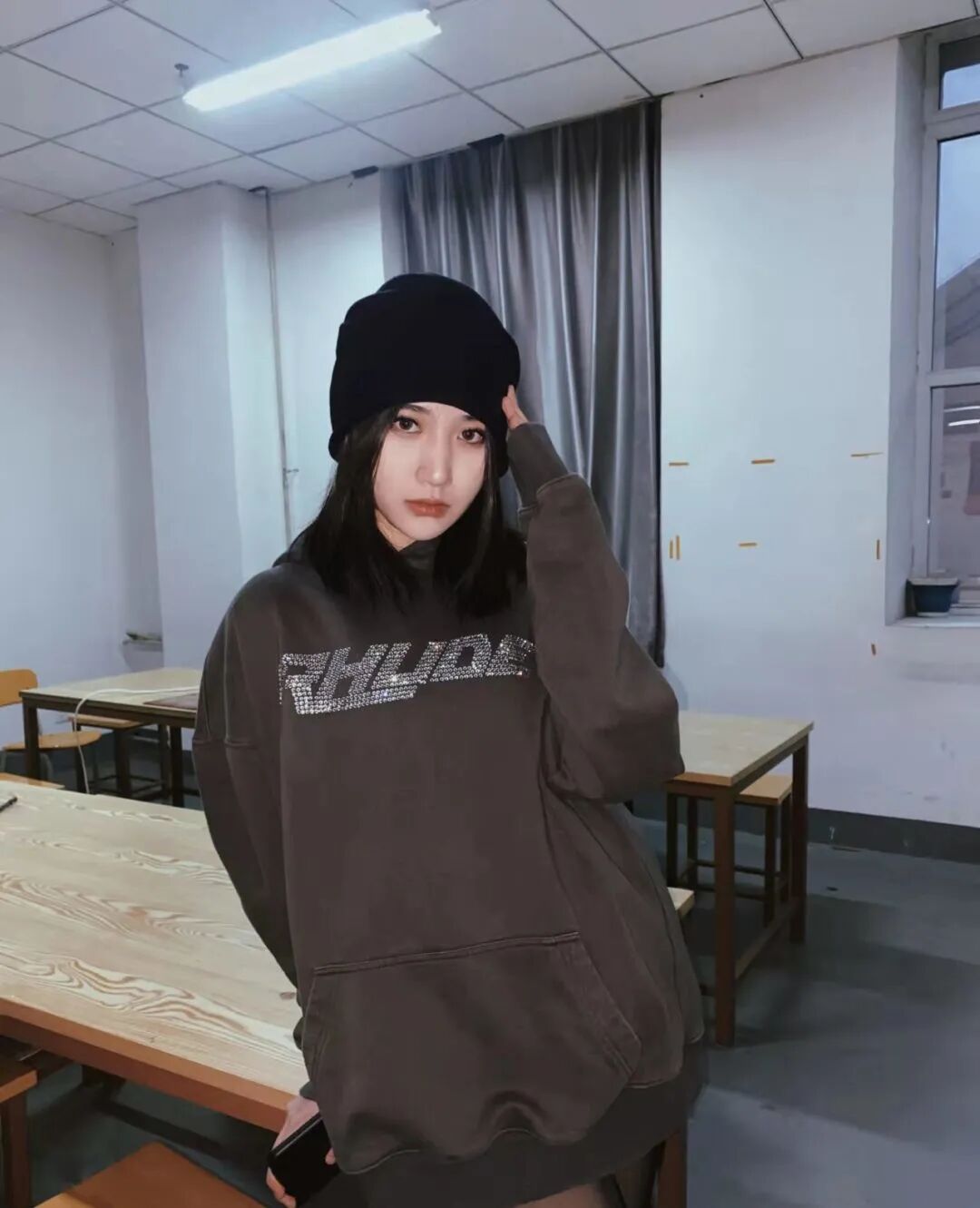 身穿中长款卫衣,再搭上色系相近的黑色冷帽,瞬间变身高冷美女。