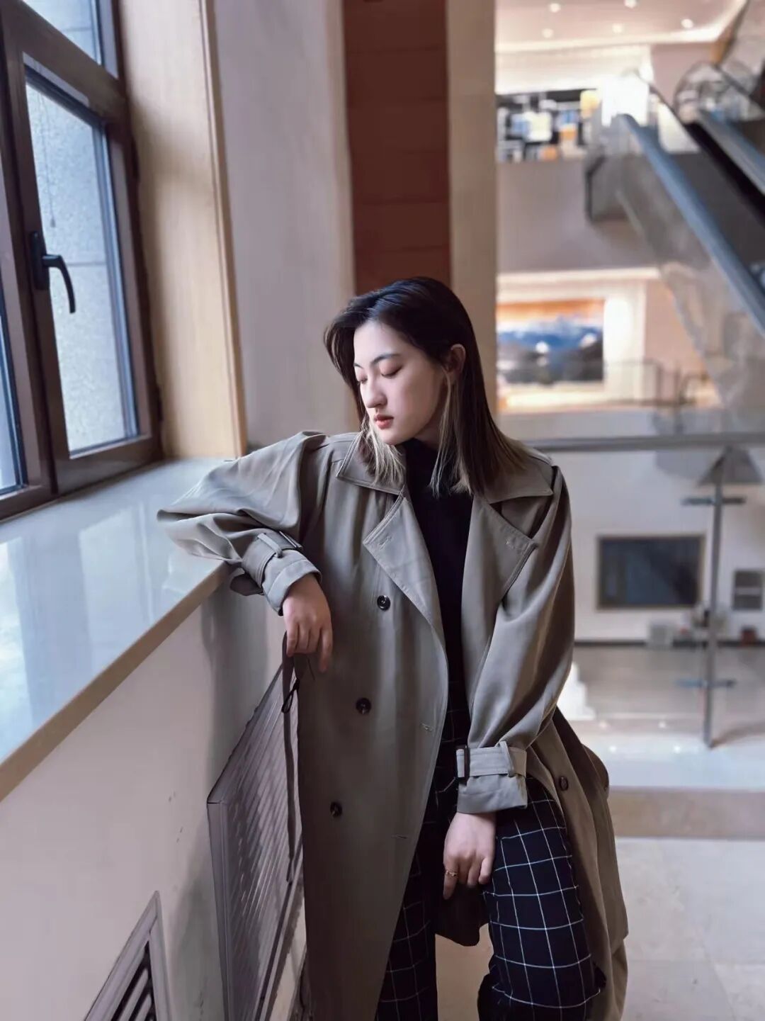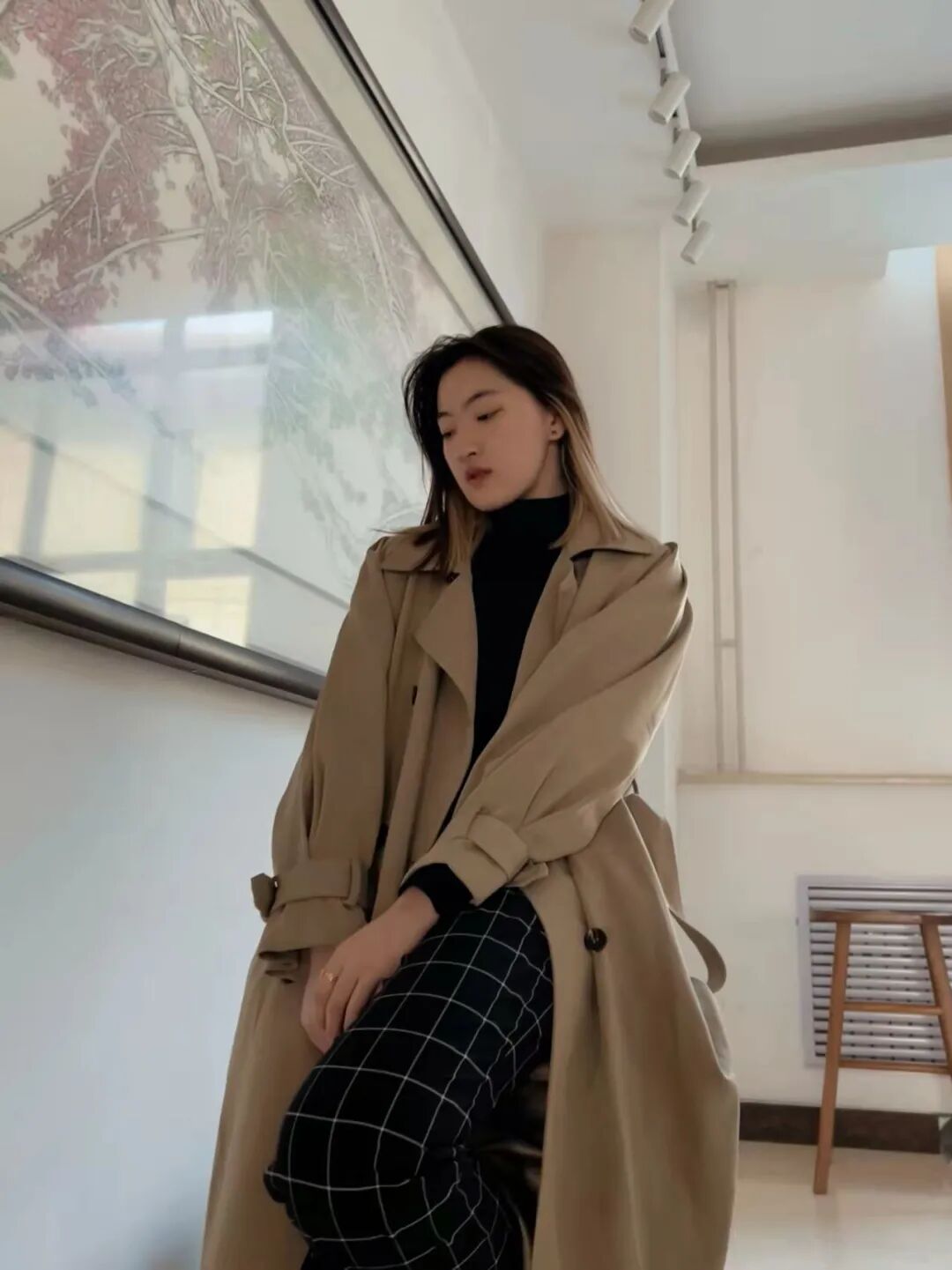 垂感风衣,内搭黑色高领毛衣,配上黑色格纹裤,整体质感一览无余。