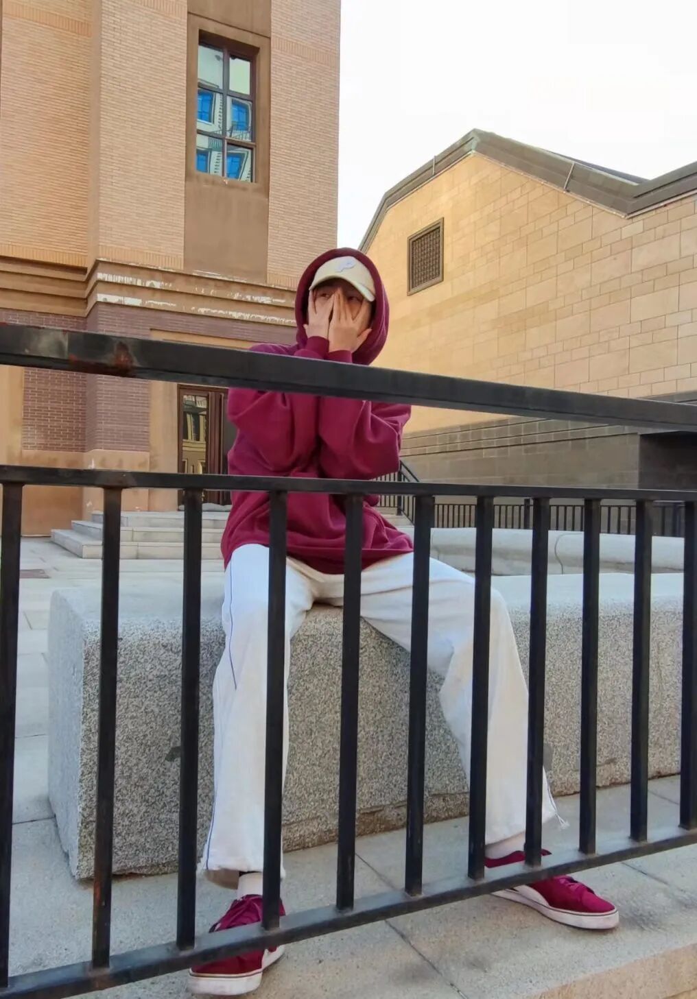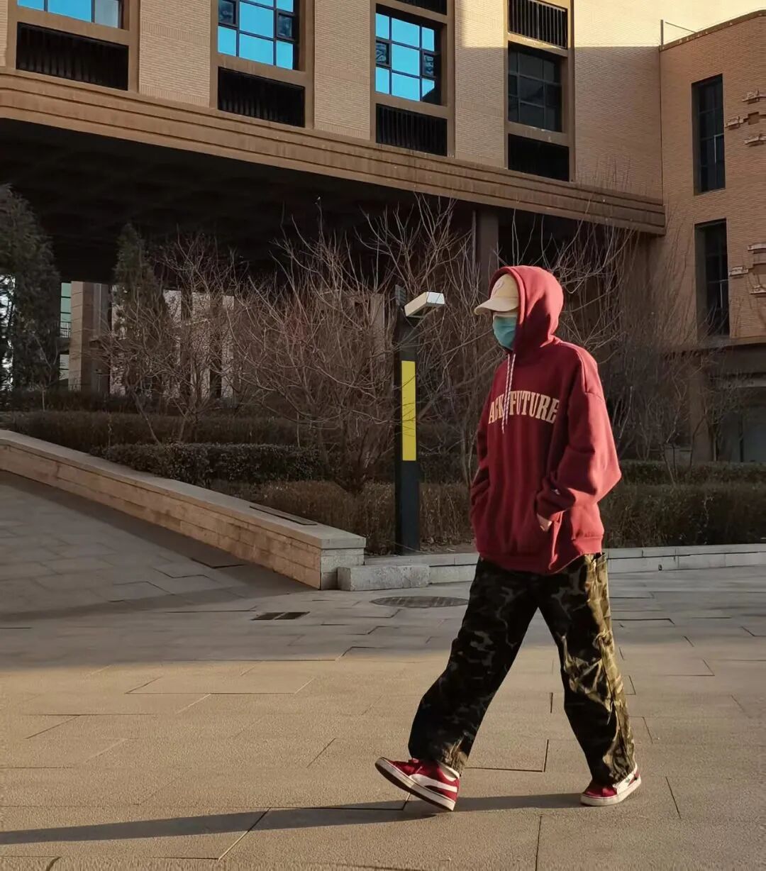 酒红色抓绒卫衣搭配一条白色垂感卫裤或者迷彩直筒裤,白底红色的板鞋,“三明治穿搭”法快快学起来!