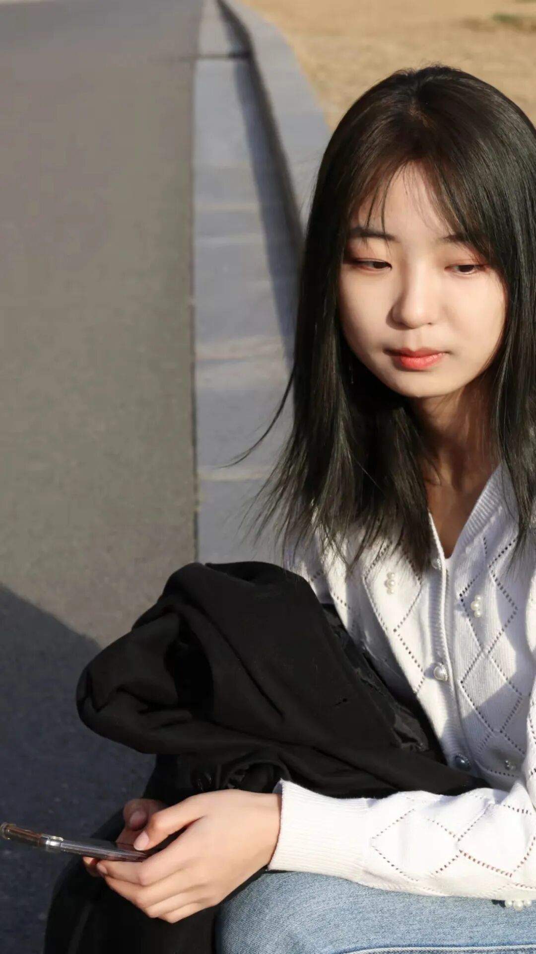 毛呢外套内衬白色开衫毛衣,点缀的珍珠增添了满满的高级感,搭配一条水洗蓝牛仔裤,是古典与优雅的完美融合!