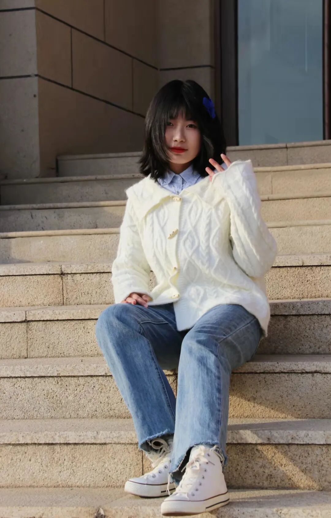 浅蓝色衬衫,外着米白色毛衣开衫,点缀的发卡和休闲的帆布鞋,展现了甜美的感觉。