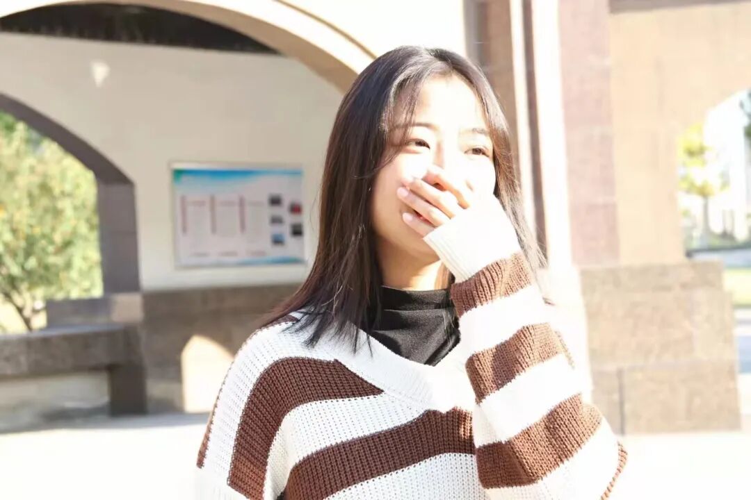 阳光映在白棕交错的毛衣,V领的设计更显层次感,让人感觉轻快又有活力。