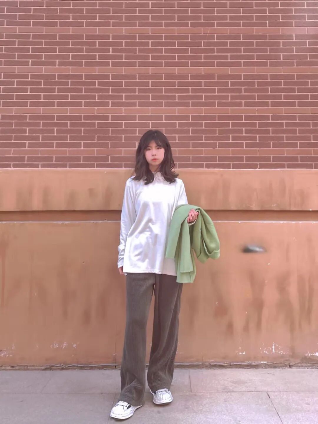 干净简单的白色长袖打底和牛油果色的外套,配上条绒长裤,简单不失干练,青春色彩十足。