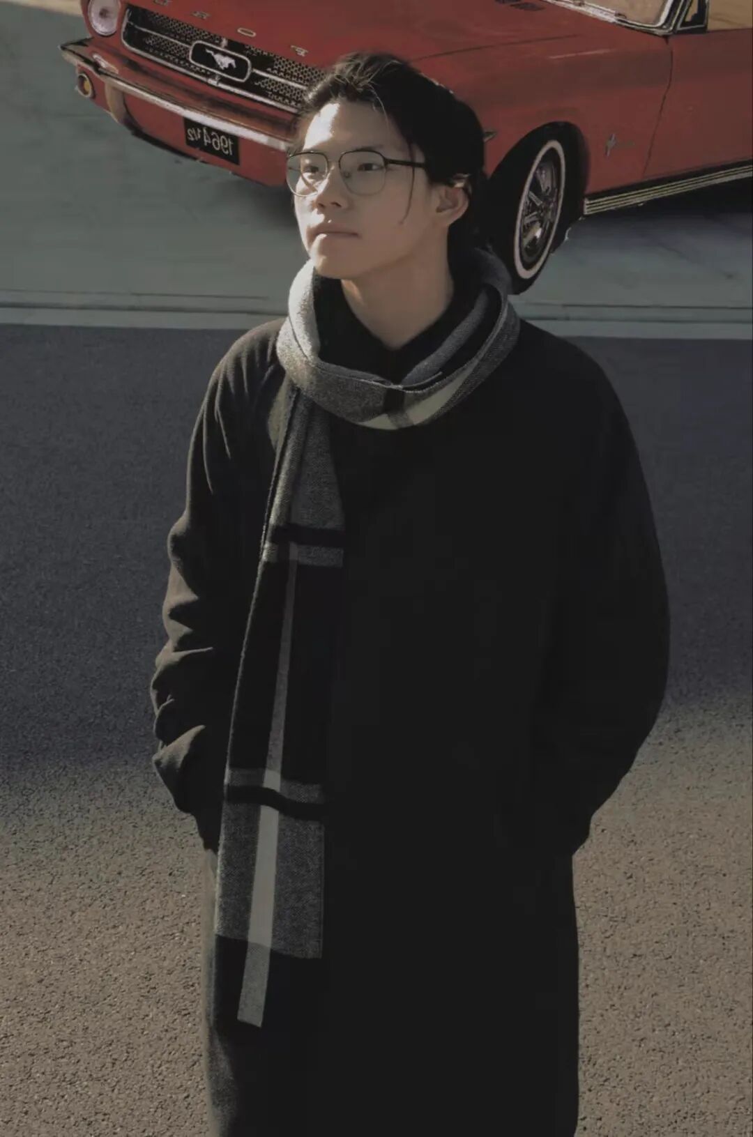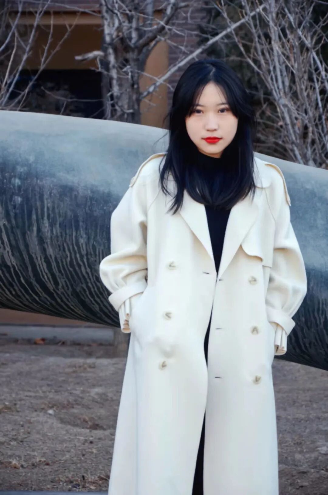 羊绒外套加灰色围巾,倚树静思,民国风满满。