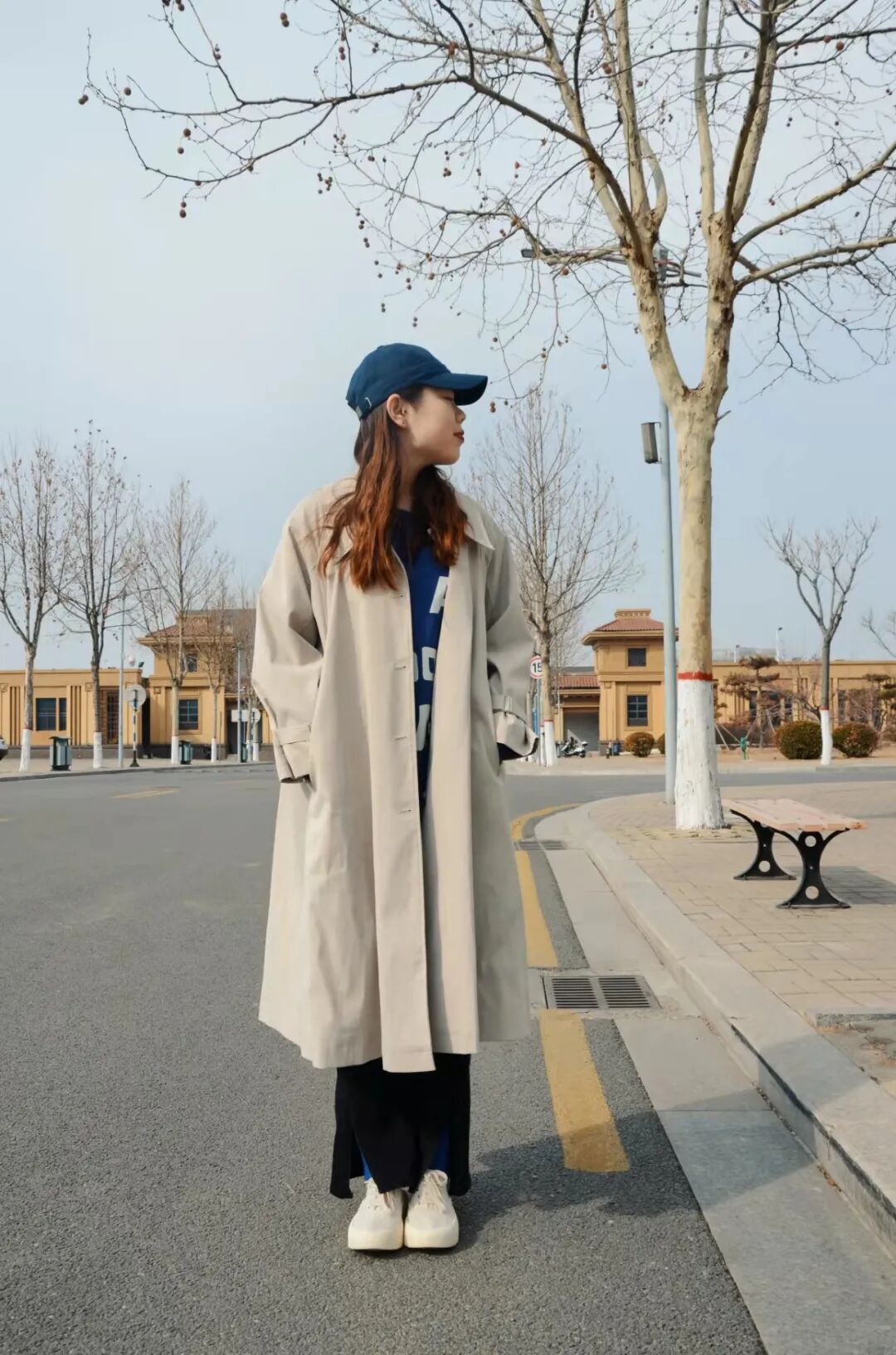 白色风衣挺阔的面料,给人一种干练的感觉,但内搭了柔软的卫衣以及风格迥异的贝雷帽,减弱了距离感。