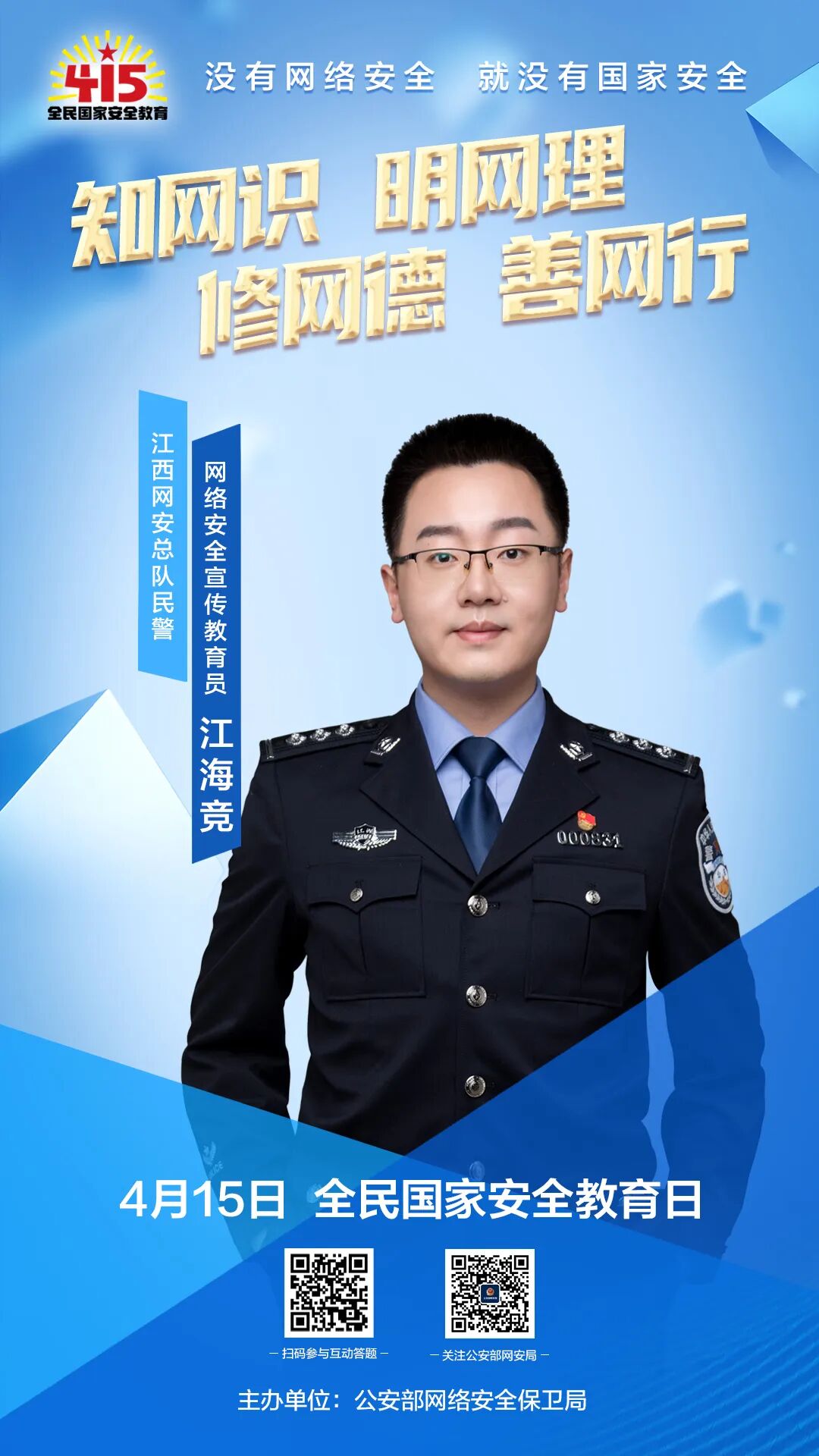 为贯彻落实总体国家安全观,深入开展网络安全教育和宣传,公安部网络安全保卫局邀请6名青年网警担任网络安全教育宣传员,邀您参加网络安全互动答题。