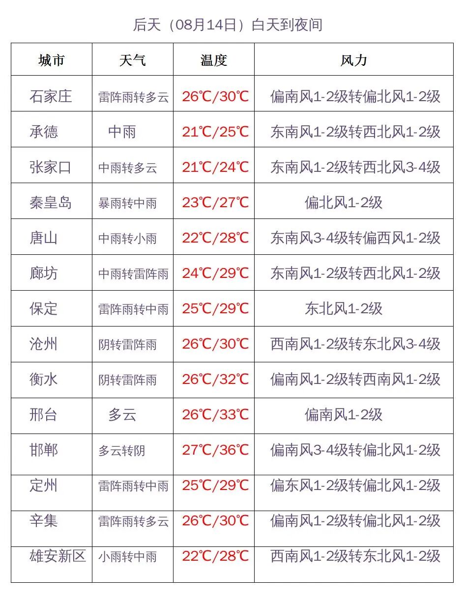 明天夜间到14日,邢台南部、邯郸多云间阴,石家庄、沧州以北地区阴有中到大雨,局地有暴雨,其他地区阴有分散性雷阵雨或阵雨。