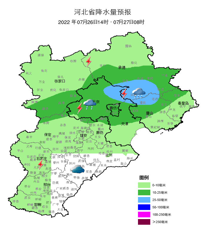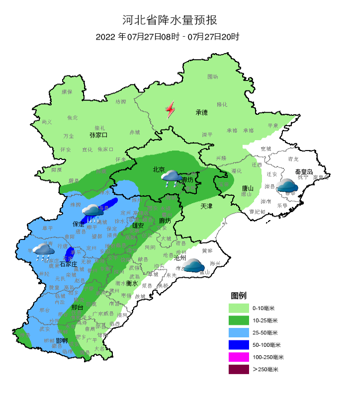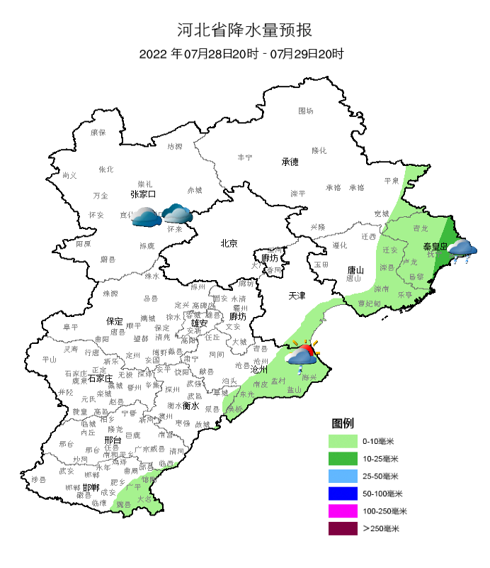 明天夜间到28日,全省阴,承德、唐山、秦皇岛、廊坊、保定中东部、雄安新区、石家庄中东部、沧州、衡水、邢台东部、邯郸东部有大雨到暴雨,其中承德南部、唐山北部、秦皇岛北部局地有大暴雨;其他地区有小雨,局地有中到大雨。上述地区降水时局地伴有雷电、短时强降水、短时大风等强对流天气。