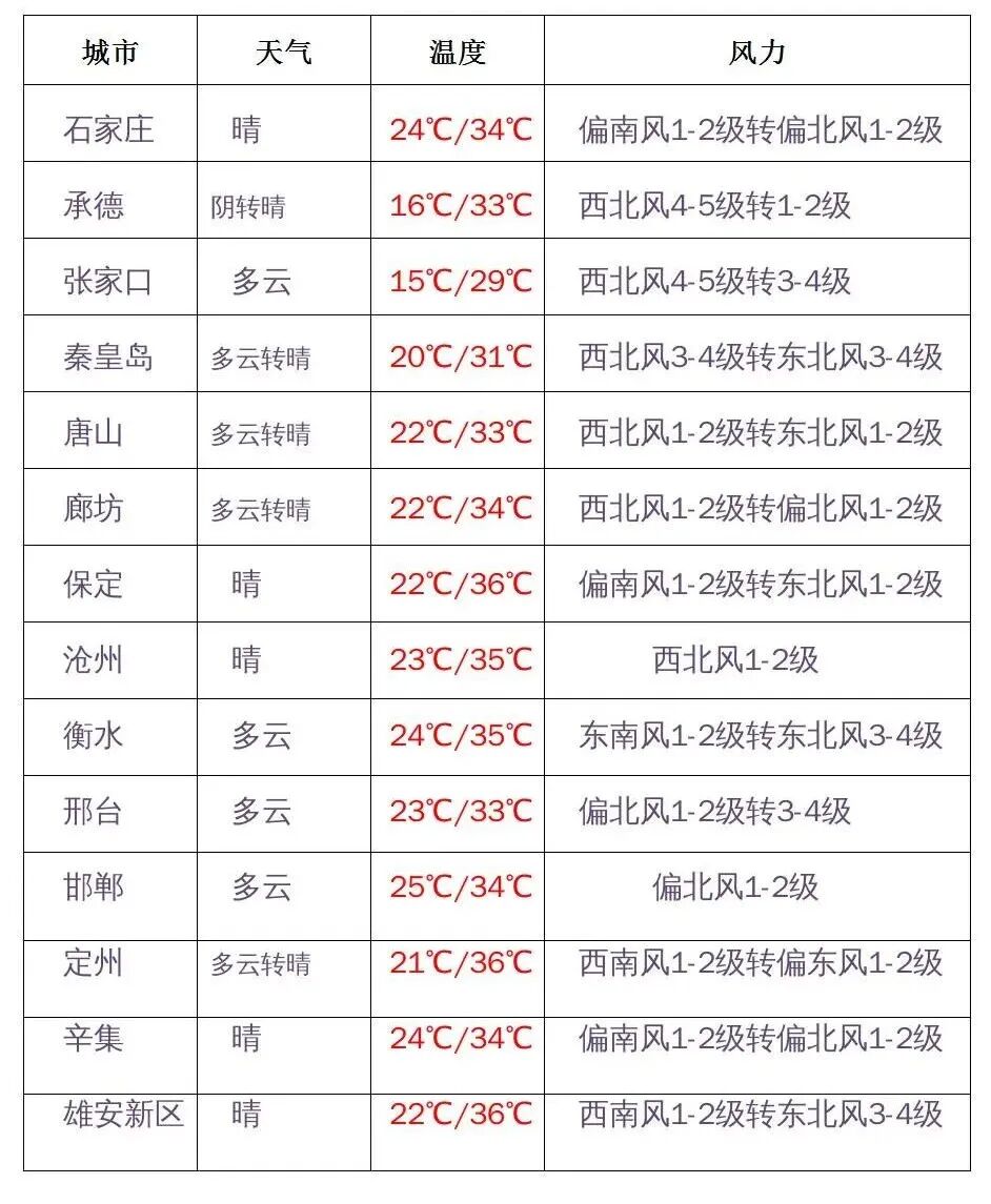 【天气】今天白天,张家口北部、承德北部、邢台西部、邯郸西部多云间阴,其他地区晴间多云。张家口、承德、保定西北部有西北风4到5级,阵风6到8级。今天石家庄晴,最低气温24℃,最高气温34℃。