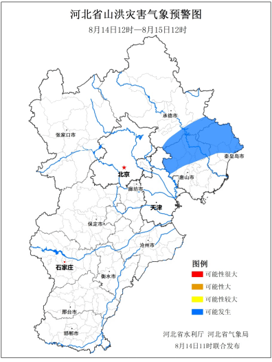 【山洪灾害蓝色预警】预计8月14日12时至8月15日12时,承德市宽城满族自治县、兴隆县、唐山遵化市、迁西县、玉田县、丰润区、迁安市、滦州市、秦皇岛市青龙满族自治县、卢龙县、抚宁区、海港区、山海关区等地局地可能发生山洪灾害。