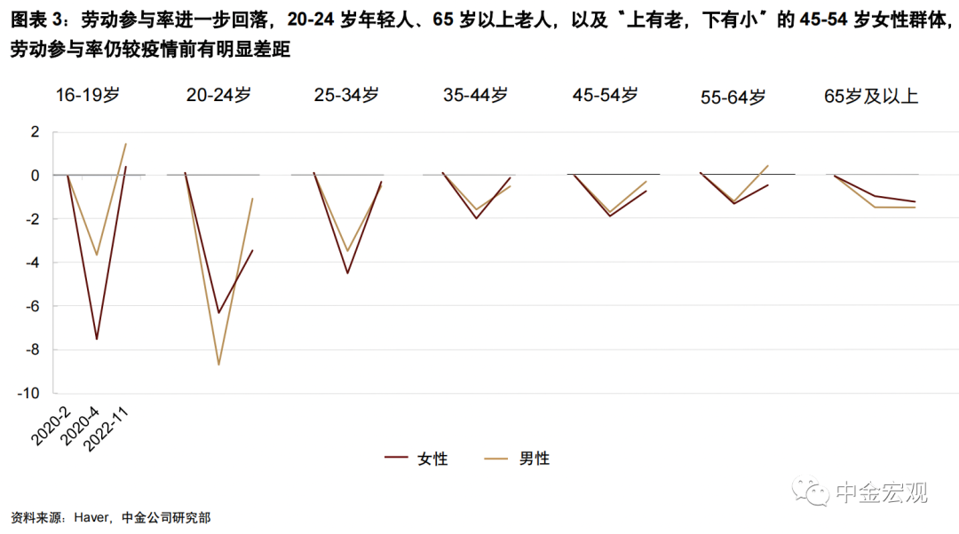 2) 年轻人工作动机下降。截至11月,20-24岁人群劳动参与率仍较疫情前低2.6个百分点,且恢复进程持续低迷。20-24岁正是接受高等教育、职业学校毕业进入社会找工作的年纪,疫情三年打乱了这部分年轻人正常求学上课、实习锻炼、毕业求职的进程,也阻断了许多线下与职业发展有关的有效交互。我们猜测疫情扰动可能对这一代青年群体带来了一定“疤痕效应”,比如降低了就业意愿[2]。