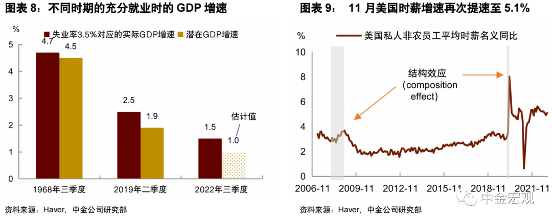 ► 劳动力供给收缩带来的结果是,经济潜在增速下降,工资通胀中枢抬升。所谓经济潜在增速,就是在没有宏观政策刺激下经济自身能够创造的产出增速。潜在增速由两个因素所决定,一是劳动力人口,二是劳动生产率。如前所述,疫情以来美国劳动力人口增长受到抑制,劳动生产率增速又呈现放缓趋势,这或意味着美国经济潜在增速已经下降。我们的估算显示,当前的GDP潜在增速可能在1~1.2%左右,已较疫情前的1.8%明显下降(请参考《中金2023年展望 | 美国:“滞胀式”衰退》)。