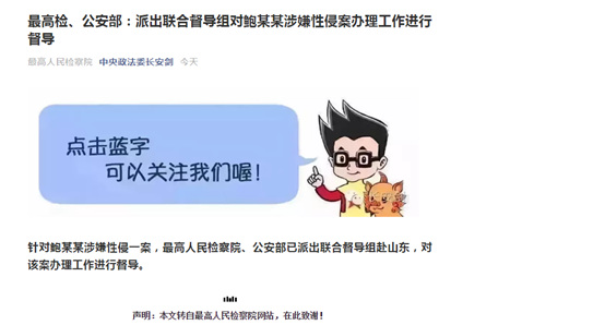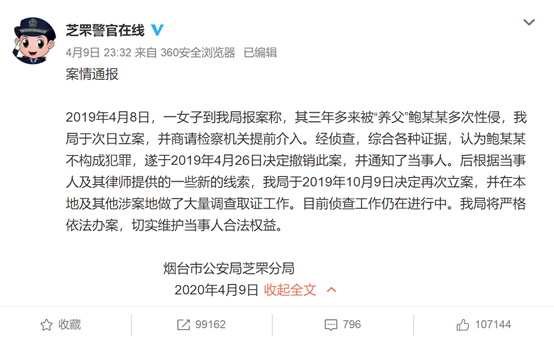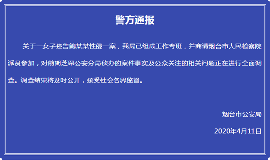 (1)自2019年10月9月芝罘分局刑事立案后,至今依然处在立案侦查阶段,烟台市公安局已成立案件的工作专班,正在对案件事实及公众关注的相关问题做全面调查核实,尚无最新的结论,而犯罪嫌疑人鲍某2020年4月11日之前一直处于取保候审阶段;