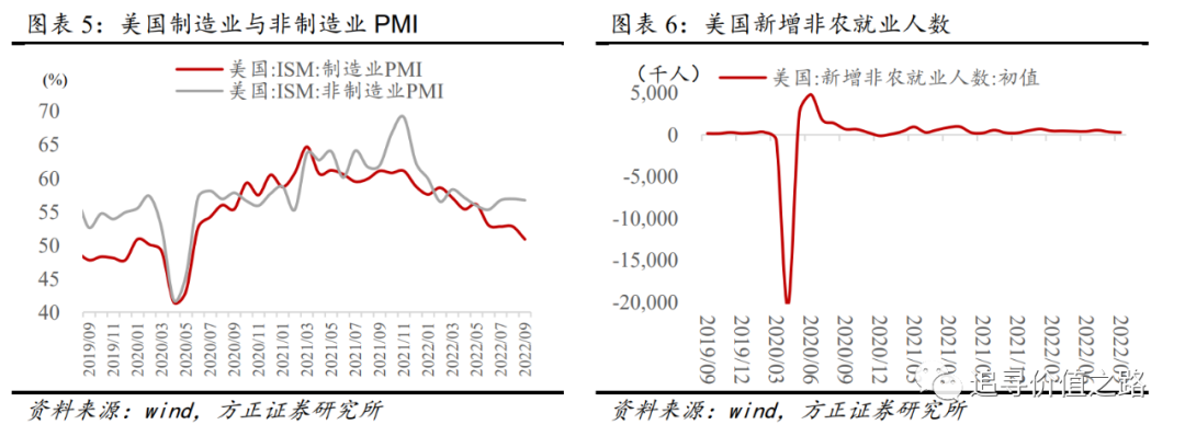 美国ISM制造业数据创2020年5月份以来新低。9月美国ISM制造业指数下降1.9个百分点,录得50.9%,创2020年5月份以来新低,低于预期的52.2%。ISM数据进一步证明美国商品需求正在放缓。分项来看,新订单指数录得47.1%,较前值51.3%下降4.2个百分点,进入收缩区间。ISM制造业物价支付指数降至51.7%,达到2020年6月以来的最低水平,原因可能是石油、金属等大宗商品价格因全球经济衰退的担忧而回落。就业指数从前值54.2%下滑至48.7%,五个月内第四次萎缩,原因可能是劳动力市场依然紧张和需求放缓。美国服务业商业活动略微下滑。9月ISM非制造业指数为56.7%,较8月56.9%有所下降。从分项来看,商业活动和新订单分项指数下滑,但整体仍然偏高。其中商业活动指数为59.1%,比8月份的60.9%下降1.8个百分点;新订单指数为60.6%比8月份的61.8%下降1.2个百分点;供应商交付指数9月为53.9%,比8月份的54.5%低0.6个百分点。美国9月新增非农就业人数再超预期,失业率再次降至近50年的低点,这表明在美联储激进加息的背景下,劳动力市场继续以温和的速度增长,失业率下降,劳动力市场依然紧张。具体来看,美国9月非农就业增加26.3万,为2021年4月份以来最小月度增幅,预期增加25.5万人,前值增加31.5万人;美国9月失业率录得3.5%,预期3.7%,前值3.7%。工资数据方面,美国9月平均每小时工资同比增5%,仍远高于新冠肺炎疫情爆发前的正常水平,预期增5.1%、前值增5.2%。9月美国非农平均时薪环比增0.3%,符合预期。美国8月CPI略高于预期,9月或继续上涨,美联储可能在11月继续加息75个基点。美国8月整体CPI环比上涨0.1%(经季调),CPI同比上涨8.3%(未季调),低于7月8.5%的同比涨幅,但仍高于市场预期。美国8月核心CPI同比大幅上升,9月或将继续维持高增幅。具体来看,商品结束快速回落阶段,进入波动平台期,同比较上月小幅上涨;服务延续2021年8月以来的上涨趋势,但增速较上月有所放缓。综合来看,9月核心CPI同比或将继续上涨。在失业率下降和工资持续高于趋势水平的情况下,预计10月的美国CPI报告或许很难阻止美联储在11月加息75个基点。![]()