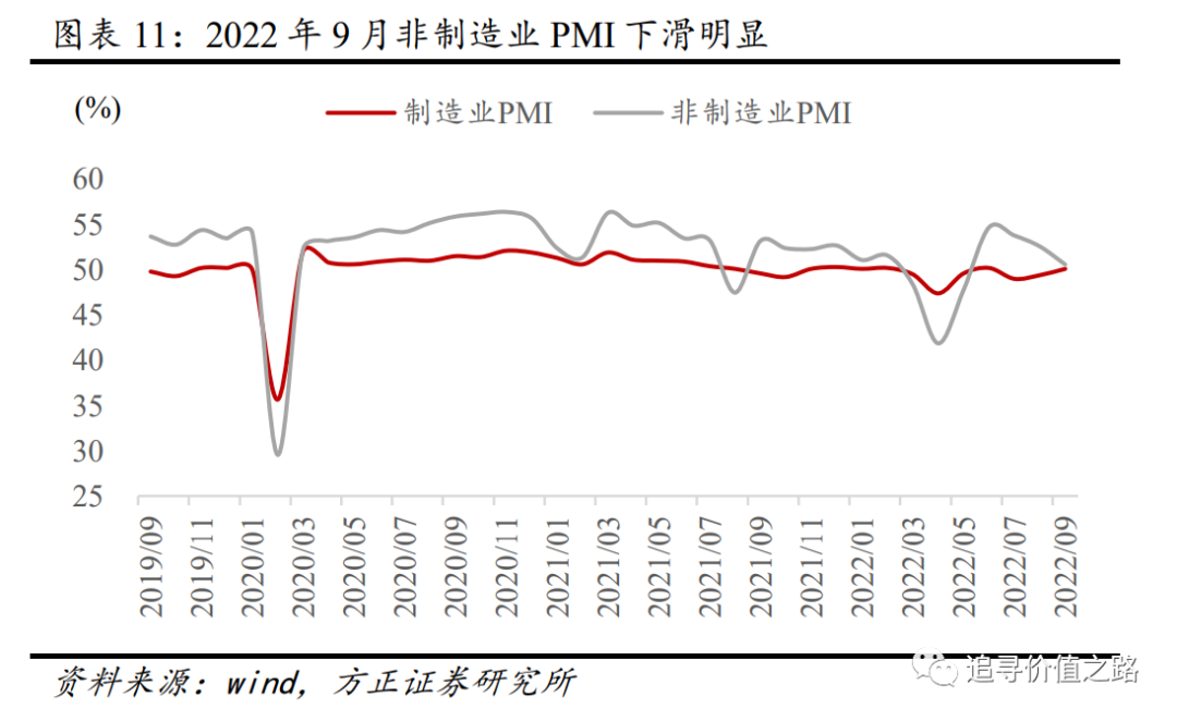 服务业活动受到疫情影响,经营受限需求减弱。9月服务业PMI录得48.9,较8月下降3个百分点,6月以来首次落至荣枯线以下。从分项数据看,9月服务业经营活动指数和新订单指数不同程度回落,均为6月以来首次降至收缩区间,显示供需双弱。主要原因是由于疫情及静默管制等防控措施,服务业经营受限,需求减弱。9月上证综指下跌5.55%,恒生指数下跌13.69%。截至9月30日,沪深两市融资余额为1.44万亿元,较上月末下降4.6个百分点。同期沪深300指数较上月末下跌6.72%。从两融余额来看,场内杠杆较上月快速下降。