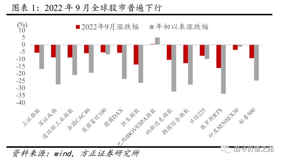 2022年9月大类资产价格多数下行,表现排序为债券市场相对领先权益市场与大宗商品市场。美联储9月货币政策会议再度大幅加息75BP,按计划逐步减持美国国债和MBS。各国央行纷纷加息,悲观预期在海外发酵,全球股市多数下行。大宗商品价格多数回落,原油价格大幅回调,工业金属价格回落,部分农产品价格上涨。债券市场方面,在加息预期之下,全球债券类资产收益率上行,而中国在全球通胀急剧上升中呈现独立走势,预计9月份CPI同比难以大幅上行,仍有空间接续落实宽松货币政策。大类资产表现具体如下:2022年9月全球股市几乎全部处于下跌状态。仅巴西IBOVESPA指数微涨0.47%,除此以外,9月上证指数下跌5.55%,深证成指下跌8.78%。9月恒生指数大跌13.69%,俄罗斯RTS指数下跌幅度达16.11%。美股方面,道琼斯工业指数下跌8.84%,标普500指数下跌9.34%,纳斯达克指数下跌10.50%。欧洲方面,德国DAX指数下跌5.61%,法国CAC40指数下跌5.92%,英国富时100指数下跌5.36%。同期,日经225指数下跌7.67%,澳洲标普200下跌7.34%。![]()