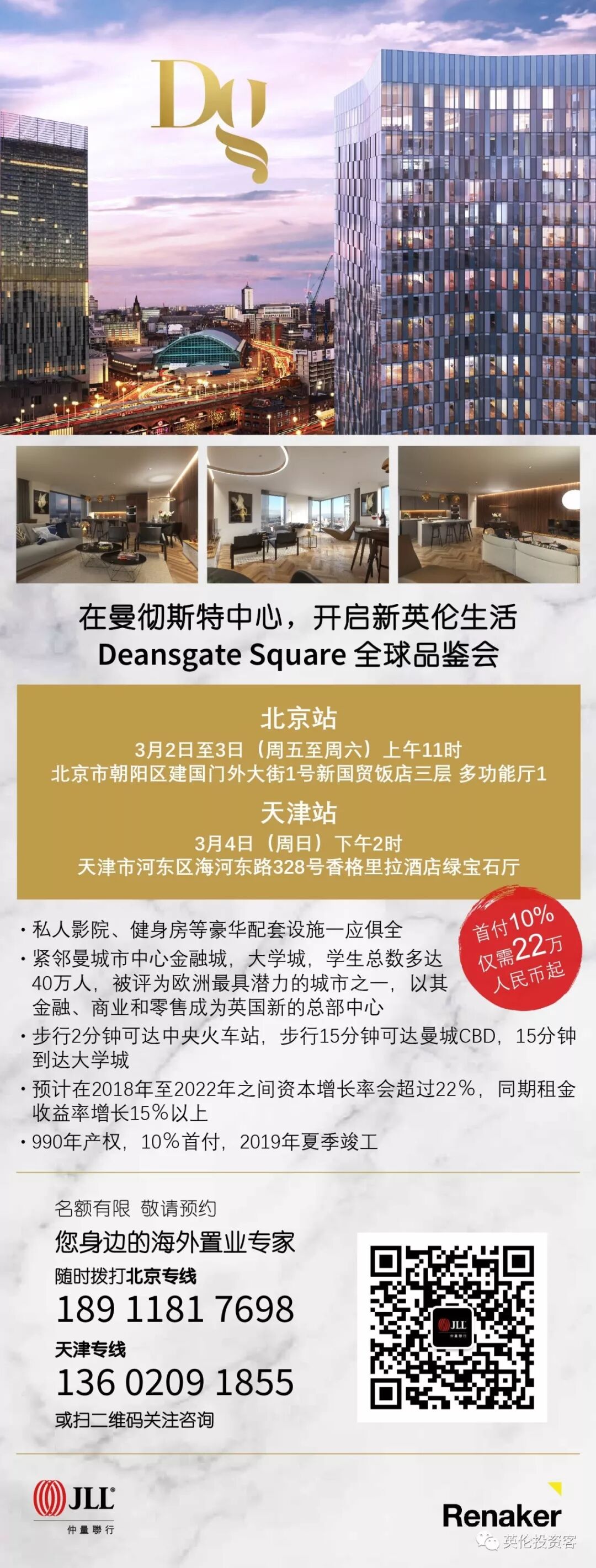 活动推荐:国际知名咨询服务机构仲量联行(JLL)将在北京3月2-3日,天津3月4日开展位于曼彻斯特市中心的Deansgate Square项目推介会,项目步行2分钟可达曼城中央火车站,步行15分钟到达曼城CBD,步行15分钟到达曼彻斯特大学城,项目产权990年,首付10%,2019年夏季竣工,拨打电话或点击阅读原文报名。