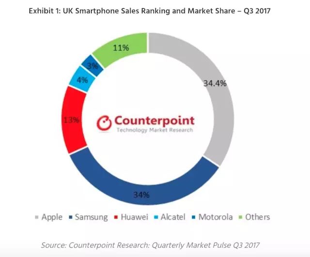 市场研究机构Counter point数据显示,2017年第三季度华为在英国按出货量排名第三,不过市场份额不高,只有13%,相比苹果三星加起来近七成的份额,还有较大提升空间。