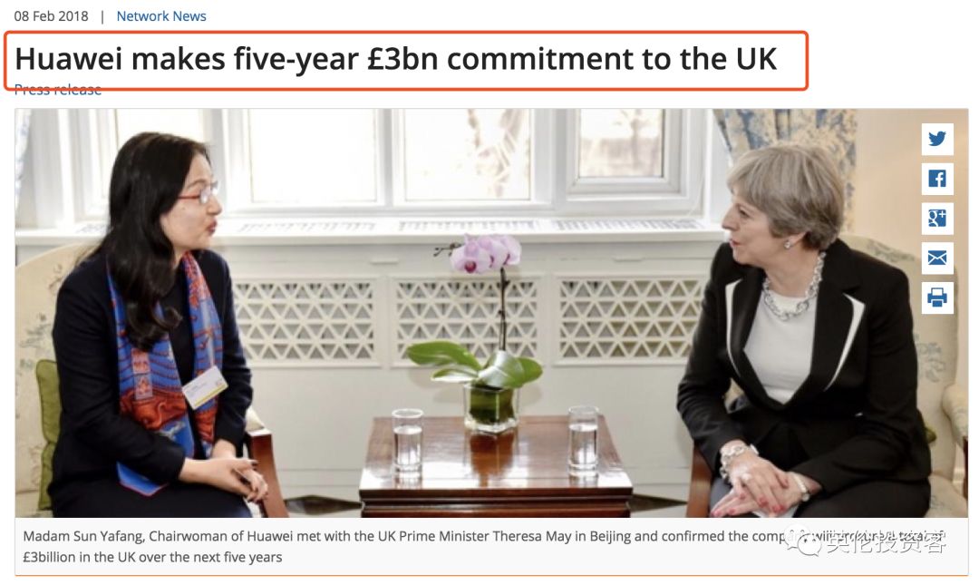 在美国频频受挫的华为于2018年2月在其官网宣布,将在未来五年对英国追加30亿英镑投资(按照最新汇率换算约合266亿人民币)。
