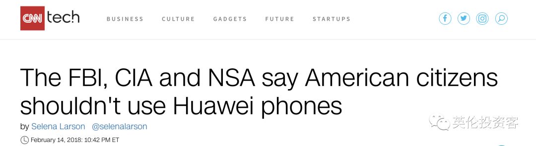 CNN(2018年2月14日)报道:美国中央情报局CIA、联邦调查局FBI、国家安全局NSA等六大情报机构明确表达了对华为和中兴在公开服务和国家情报方面的不信任,呼吁美国市民停止使用华为手机。