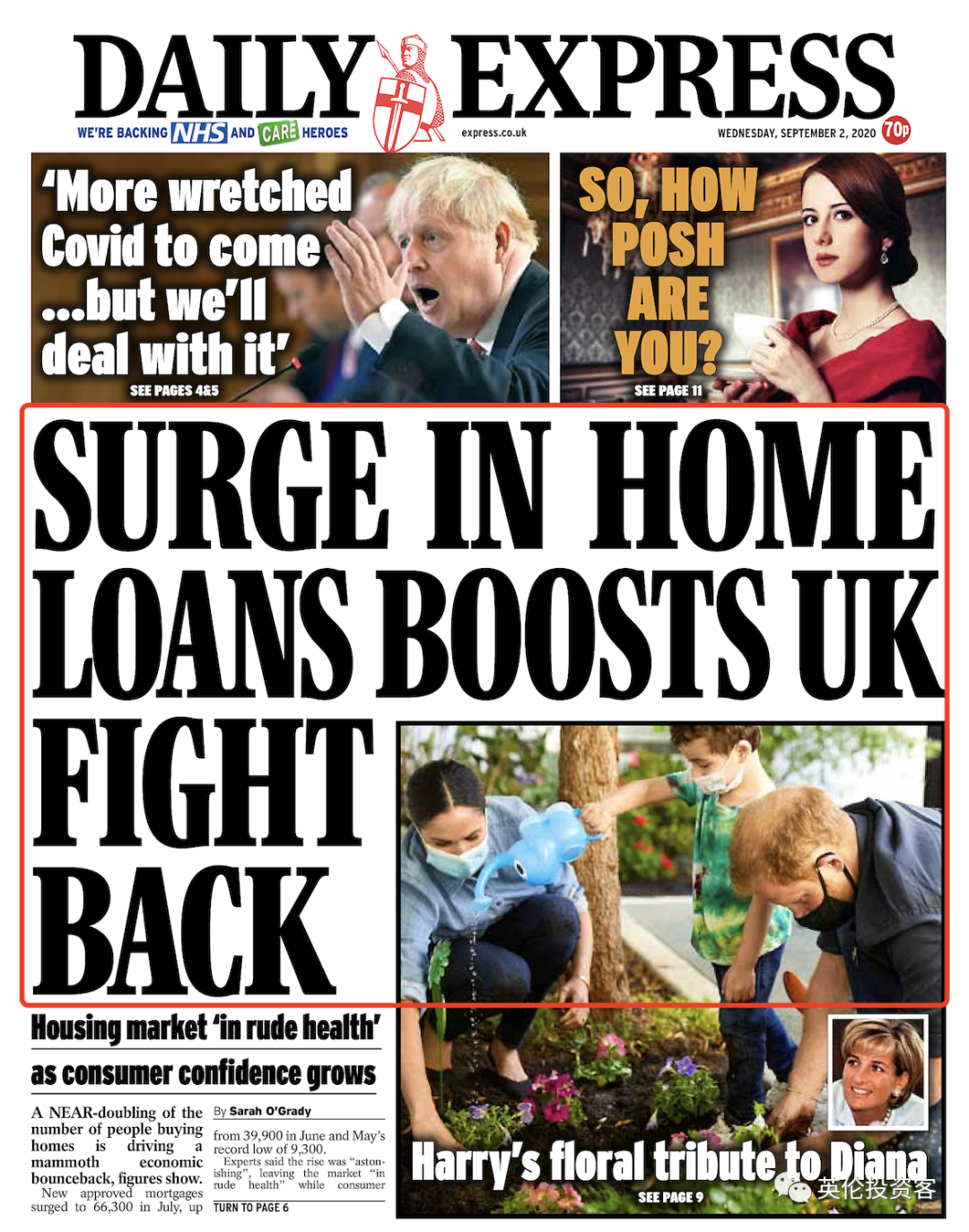 《每日快报》也特别把这一数据放上9月2日的头版,指出英国房贷市场已恢复至疫情前水平。