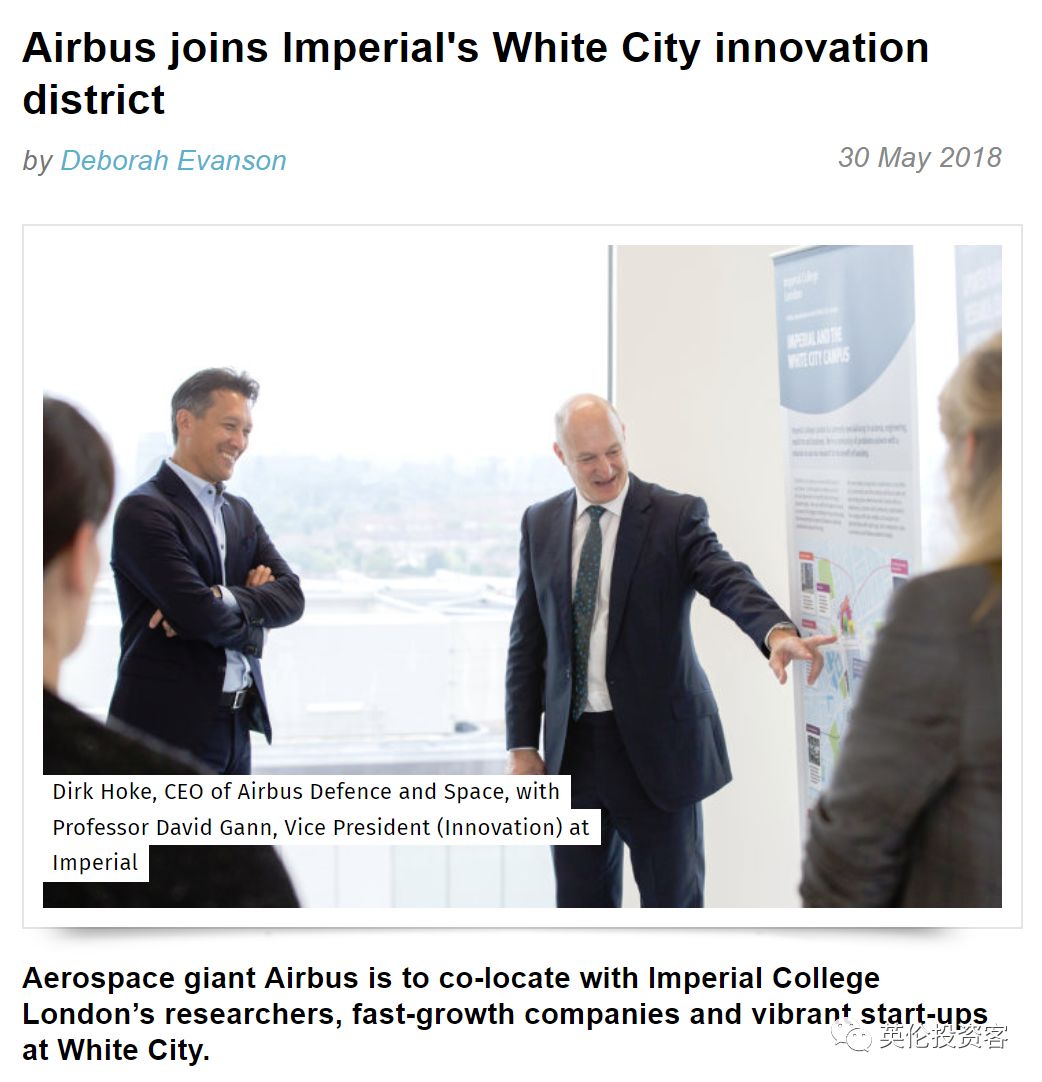比如,航空巨头欧洲空中客车(Airbus)宣布加入到帝国理工学院所在的白城创新区,并要在当地建立一个新的国防和太空部门,与学院的研究人员共同研发未来航空科技的应用。