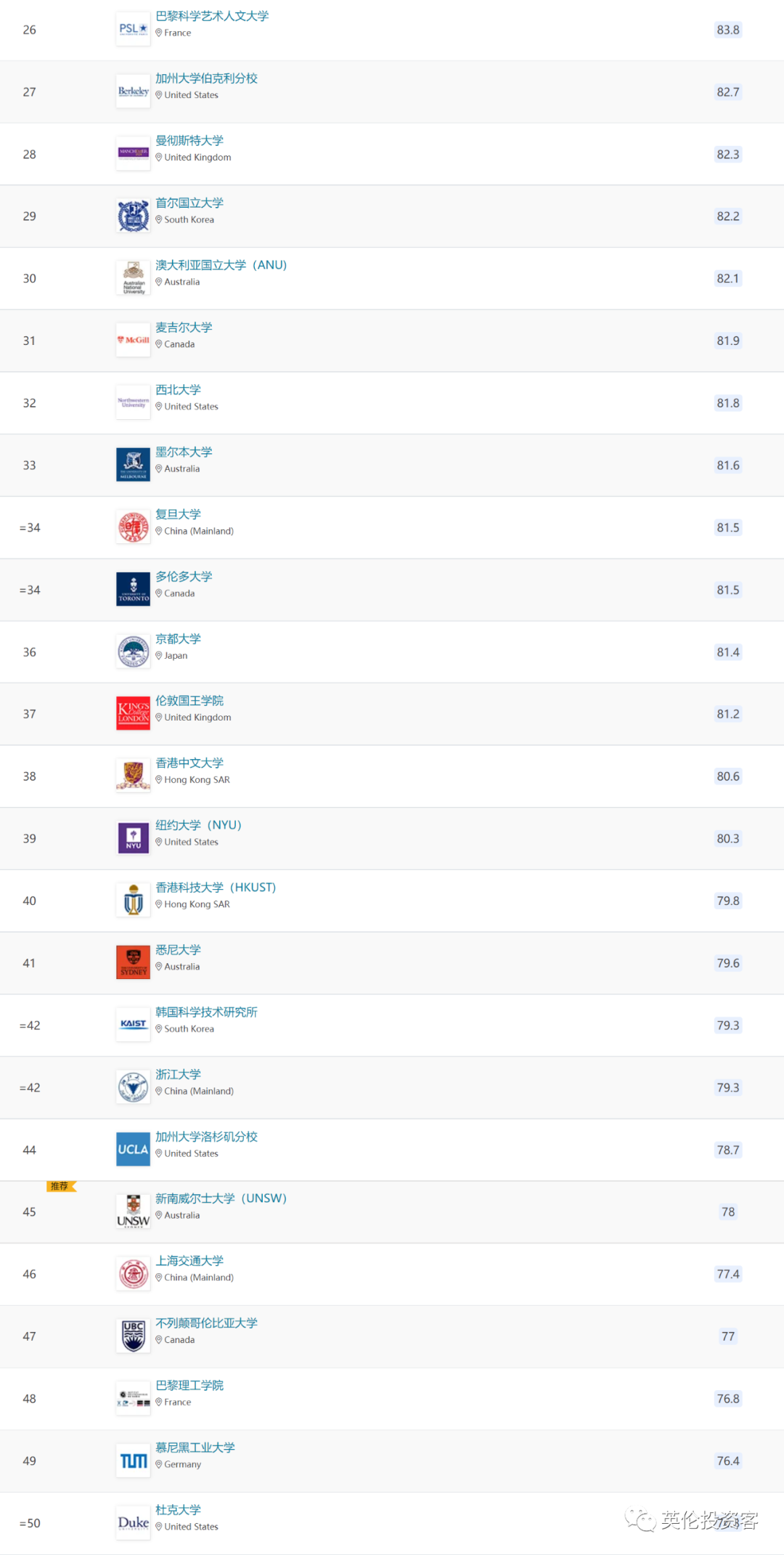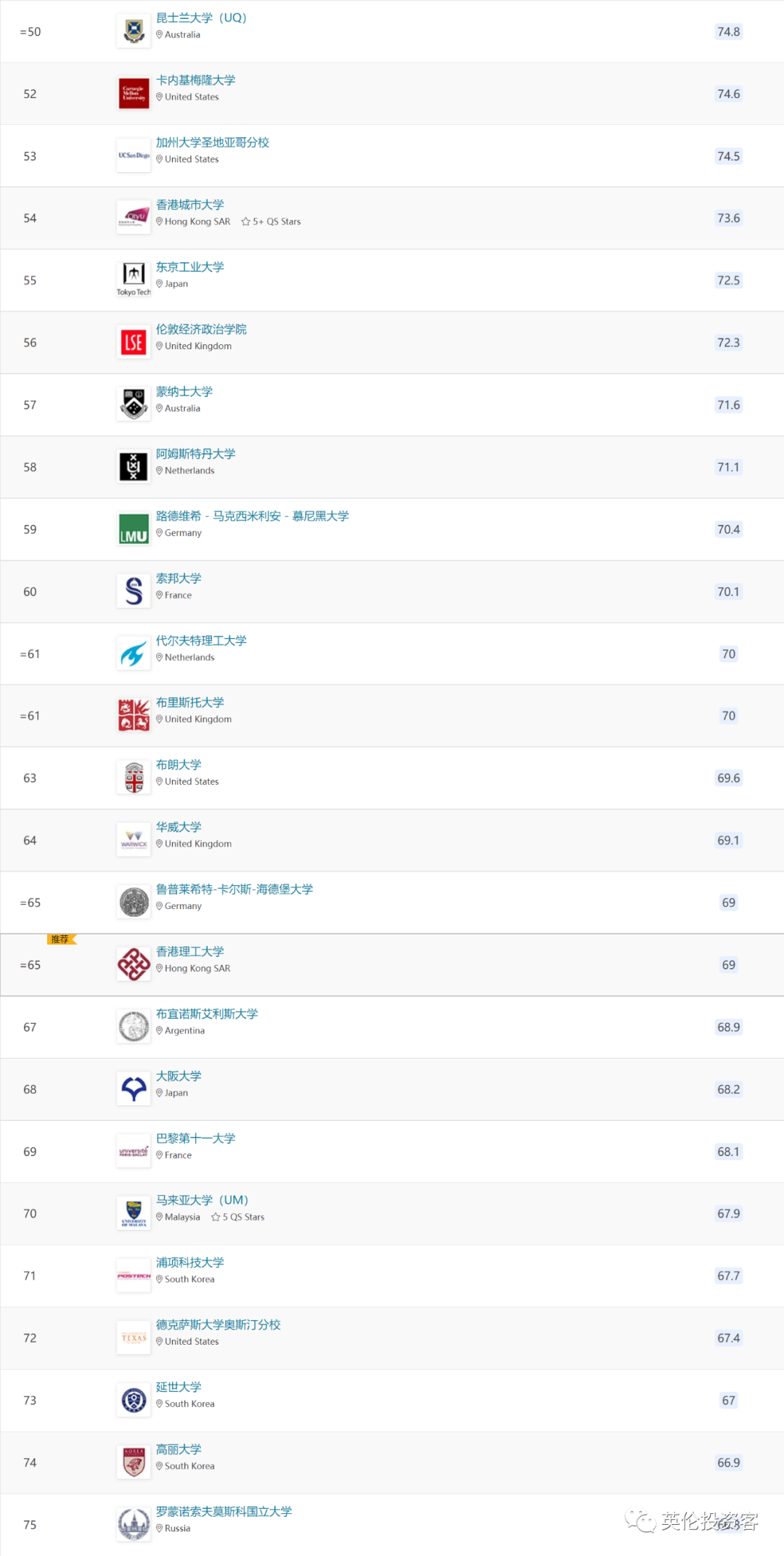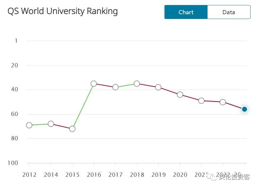 数据显示,伦敦政经(LSE)的排名有所下滑,从去年的49下降至今年的56名。![]()