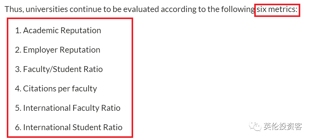 作为世界上最具权威性、公信力和影响力的大学排名之一,QS采用了非常一致的排名方法框架,基于6个关键指标对大学进行打分:![]()