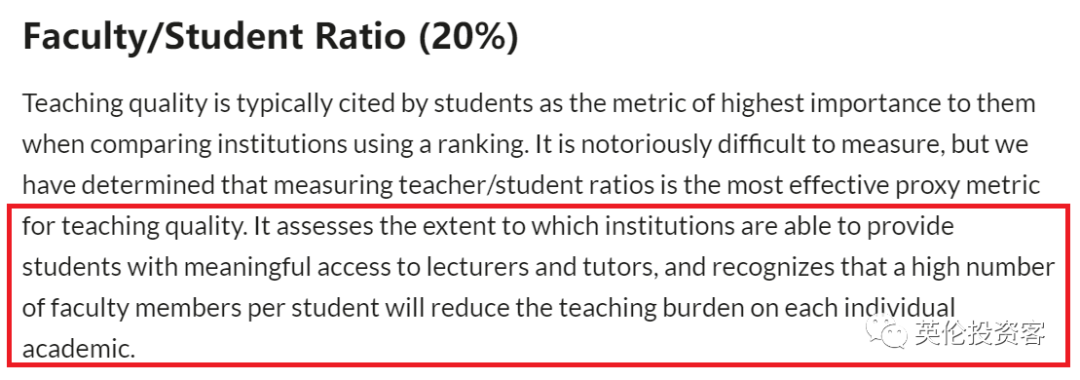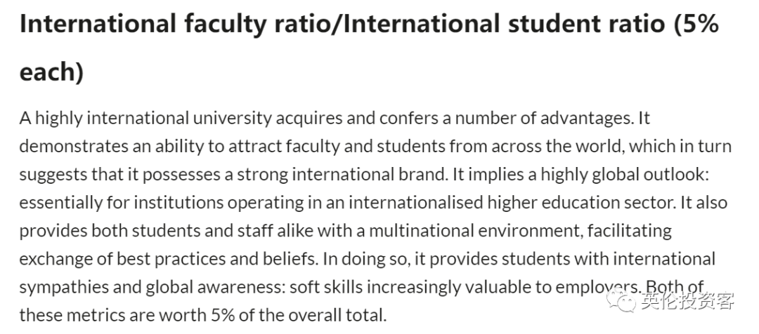 1)学术声誉(Academic Reputation)40%基于超过151,000名学者的调查问卷反馈,调查他们对高校教学和科研的看法,是世界上同类调查中规模最大的。2)雇主声誉(Employer Reputation)10%基于超过99,000名雇主关于大学毕业生就业水平调查问卷的答复,也是世界上同类调查中规模最大的。3)师生比(Faculty/Student Ratio)20%一所大学的教学质量是很难衡量的,QS认为师生比是衡量大学教学水平最好的替代方法。师生比例越高,学生获得的关注度可能就越高。4)人均文献引用率(Citations per faculty)20%考察学校的科研水平。通过将五年内发表的所有论文被引用的总数与该大学的教员人数相比较进行衡量。引文数据均来源于Elsevier’s Scopus,世界上最大的学术期刊数据库。5)国际教职比率(International Faculty Ratio)5%QS的两个国际化指标之一,衡量大学中非本国教师的比例。6)国际学生比率(International Student Ratio)5%QS的两个国际化指标中的第二个指标,衡量一个大学中的非本国学生群体比例,这也可以表明大学吸引世界各地人才的能力。 ![]()