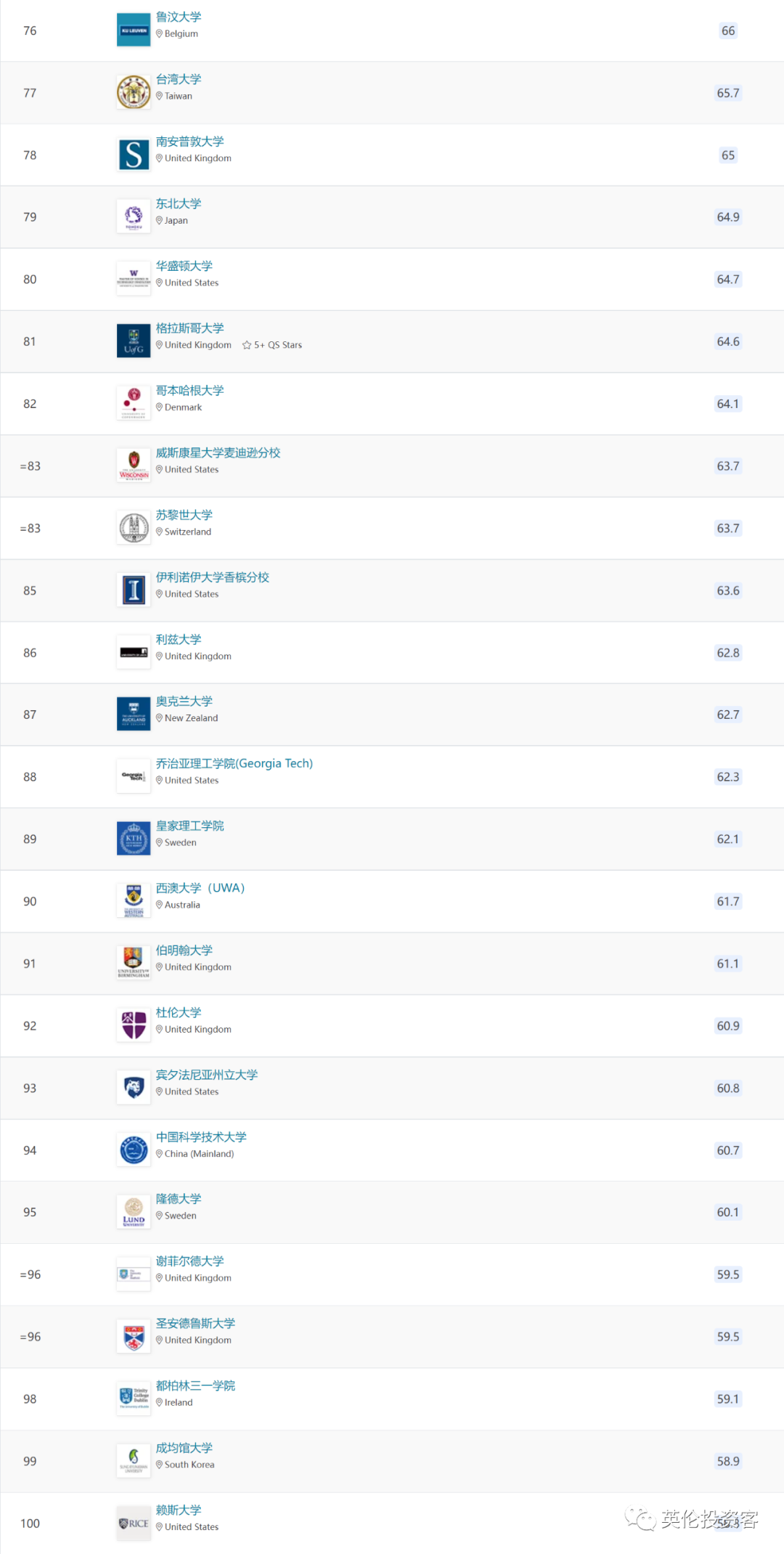 位于苏格兰的格拉斯哥大学的排名下降8位,从去年的73下降至今年的81名。![]()