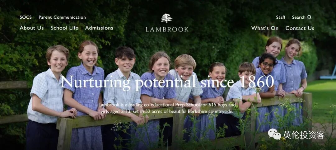 Lambrook School始创于1860年,是一所男女混校。从地理位置上看,Lambrook School离英国皇家赛马会举办地Ascot很近,只有10分钟的车程,据温莎城堡也就24分钟车程。事实上,Lambrook School是一所名副其实的贵族学校,起初仅接收温莎城堡中的贵族儿童,从1992年开始才对外接收3-13岁适龄儿童。维多利亚女王的两个孙子、英国前首相阿斯奎斯的三个儿子、诺贝尔经济学奖得主詹姆斯·米德和英国威严葡萄酒创始人吉尔斯·克拉克等都曾在这里读书。2016年,Lambrook School还被英国高端杂志《Tatler》评为年度预备私校。学校环境及硬件设施也保持着贵族般的水准,拥有52英亩的运动场地、恒温游泳池、艺术表演中心,甚至还开辟了果园,让学生更好地亲近自然。![]()