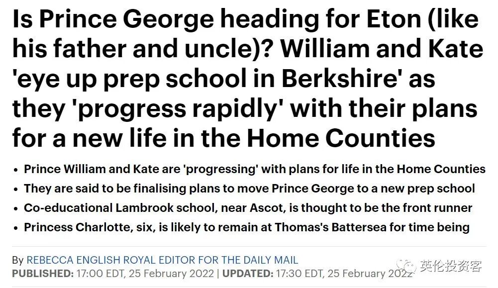 路易斯小王子——威尔科克斯幼儿园(Willcocks Nursery School)去年(2021年),威廉和凯特的第三个孩子——路易斯小王子也到了上幼儿园的年纪。路易斯出生于2018年4月23日,是英国王位第五顺位继承人,仅次于自己的爷爷查尔斯王子、父亲威廉王子、哥哥乔治王子及姐姐夏洛特公主。追随姐姐的步伐,路易斯小王子就读于威尔科克斯幼儿园(Willcocks Nursery School),就在自家肯辛顿宫隔壁,步行时间仅需11分钟。如上图所示,这家幼儿园隔壁就是大名鼎鼎的皇家阿尔伯特音乐与和帝国理工学院。稍往北走就是肯辛顿公园和海德公园,往南则是自然历史博物馆和科学博物馆,地理位置非常优越。威尔科克斯幼儿园的校风是“高标准、卓越和礼貌”,被英国教育标准局评为优秀(outstanding)。这家幼儿园只招收2-5岁的学生,在校生总共只有40名左右,师生比例分别为1:8(上午班)和1:4(下午班)。由于每年招生名额太少,因此该校的入学竞争非常激烈,如果想要申请这所幼儿园的话,需要在孩子出生时就去注册,这样才能稍微增加一些几率。学费方面,威尔科克斯幼儿园早班学费一学期是3400英镑,下午班一学期学费是2250英镑,午餐俱乐部(Lunch Club)费用一学期在为500-1875英镑不等,根据学生选择的天数收费。如果选择全天+每周一次午餐俱乐部,一年的学费差不多是3400+2250+500=6150英镑*3(18450镑),折合人民币约17万。一直以来,英国王室的教育都是大众津津乐道的话题,共同之处就是延续了英国私校倡导的“精英教育”模式。我们曾经在《揭秘英国精英教育路线图》一文中写过,英国确实存在一套行之有效、且不成文的精英教育路线图,通常会经历贵族精英幼儿园、预备私立小学、传统贵族精英公学、牛剑-G5-罗素大学集团四个阶段。不少家长和学生倾心于英国教育体系的原因,就是精英教育能够拓展他们的眼界、格局、能力和人脉,从而影响他们人生轨迹。毕竟,精神层面的耳濡目染比物质更为深远,而这就是教育的意义,也是英国精英教育长盛不衰的秘诀所在。英伦投资客—原创教育、移民、投资干货: