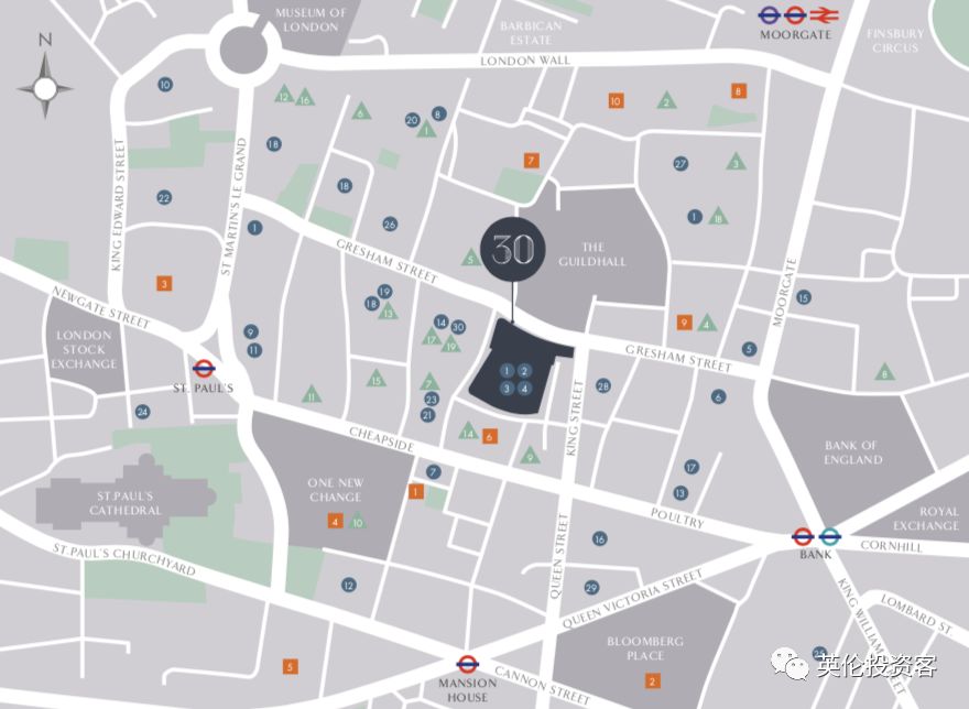 30 Gresham Street大楼位置极其优越,地处伦敦金融城核心,位于金融城市政厅(Guildhall)正对面,距离英格兰央行、圣保罗大教堂、伦敦证券交易所直线距离都只有200米。